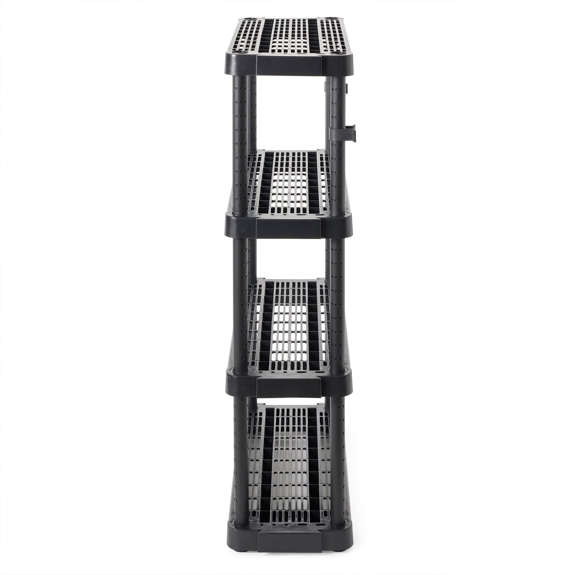 This bathroom storage shelf showcases timeless elegance for functional spaces with its lightweight, plastic construction and sleek color. Easily snap together for a simple installation process, and interconnect with additional units side-by-side for more storage space. Each ventilated shelf supports up to 150 pounds, providing a 600-pound unit capacity overall. Make sure that you distribute the weight evenly on the shelves for optimal, lasting use. With the adjustable 4 shelves, you can organize laundry supplies, seasonal clothing items, home decor, toys, crafts, or tools. Simply use the slide and lock technology to easily adjust the shelves. The closet storage shelf measures 32 inches long, 14 inches wide, and 54.5 inches tall offering a storage solution for any room. For added versatility, you can use the included brackets to mount the plastic shelves to the wall.