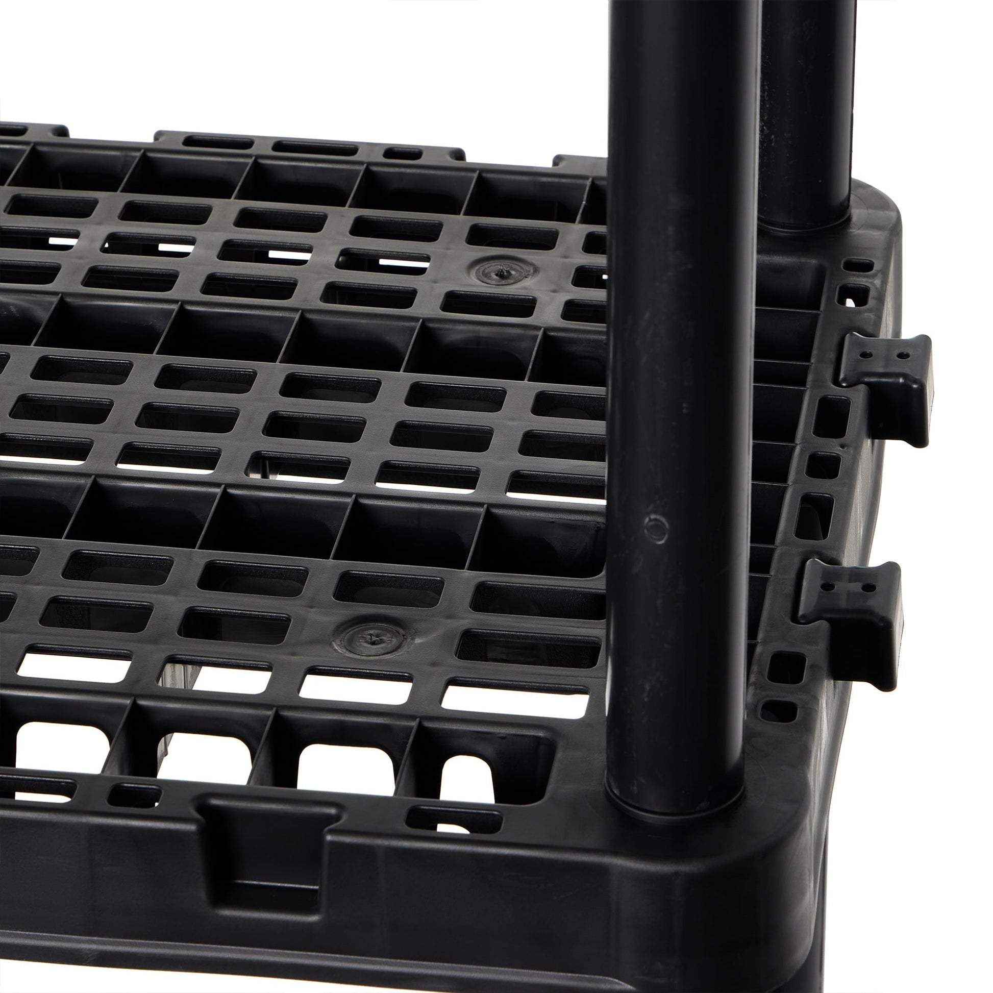 With its simple, no-tool setup, lightweight body, and black coloring, you can easily make this storage unit work in any room of the house. Easily snap all the included parts of this multi-purpose unit together for a simple, no-stress installation process. Plus, with the Knect-A-Shelf feature, you can interconnect multiple units from any side for added storage space (additional units sold separately). Constructed of durable and lightweight materials, the storage possibilities are endless. Each shelf is ventilated and made to support up to 150 pounds and up to 750 pounds overall, allowing you to organize seasonal clothing items, home decor, toys, supply crafts, and other tools or accessories. Make sure that you distribute the weight evenly on the fixed shelves. This organizing shelf offers an ideal height for both kids and adults and is a great addition to any home or office space.