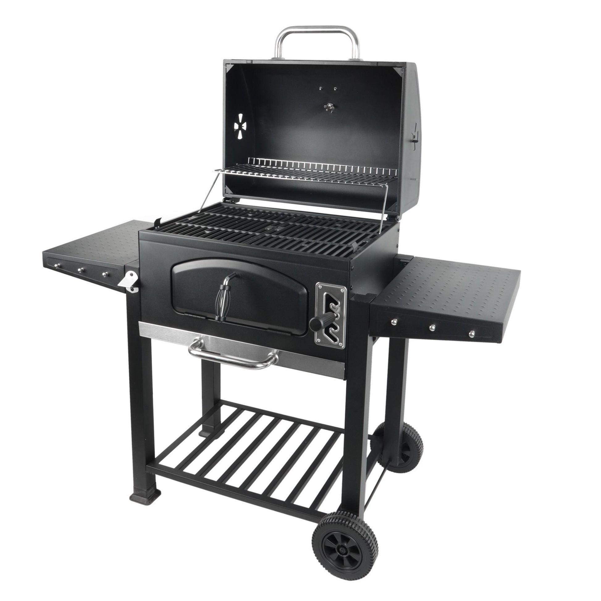 Side shelves provide room for prepping ingredients, holding sauces, and storing utensils, while the bottom storage shelf keeps everything within easy reach. With durable wheels, you can effortlessly move the grill from your patio to the backyard or even take it along for tailgating adventures. Whether you're a seasoned grilling expert or just getting started, this charcoal grill makes it easy to create delicious meals for any occasion.