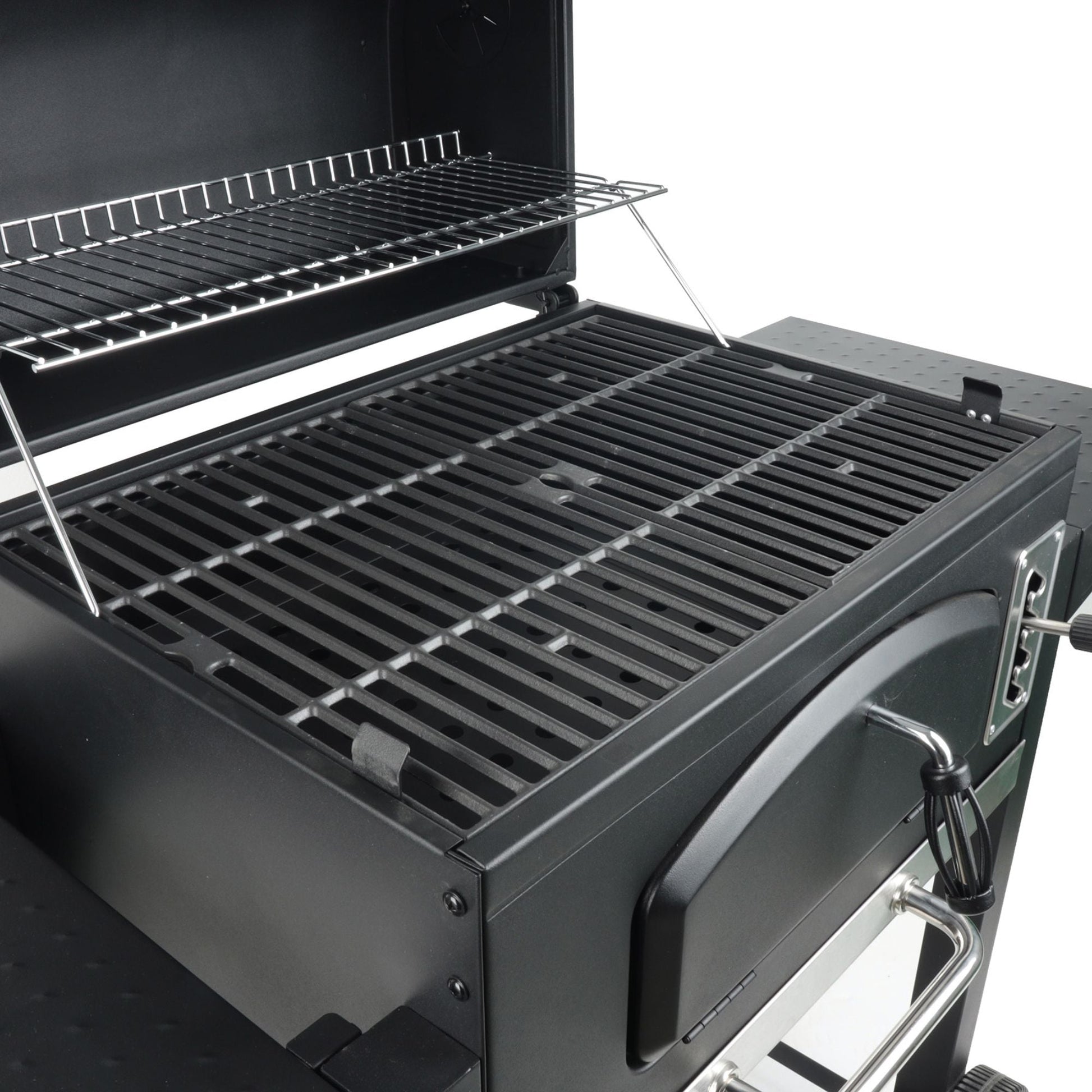 - Stainless steel lid handle provides a secure grip when opening the grill