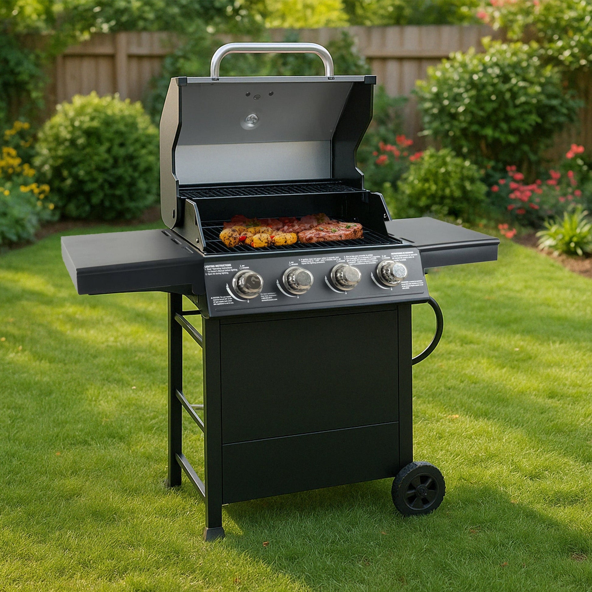 - Outdoor 4-burner gas grill with side burner for backyard grilling, BBQs, and weekend cooking