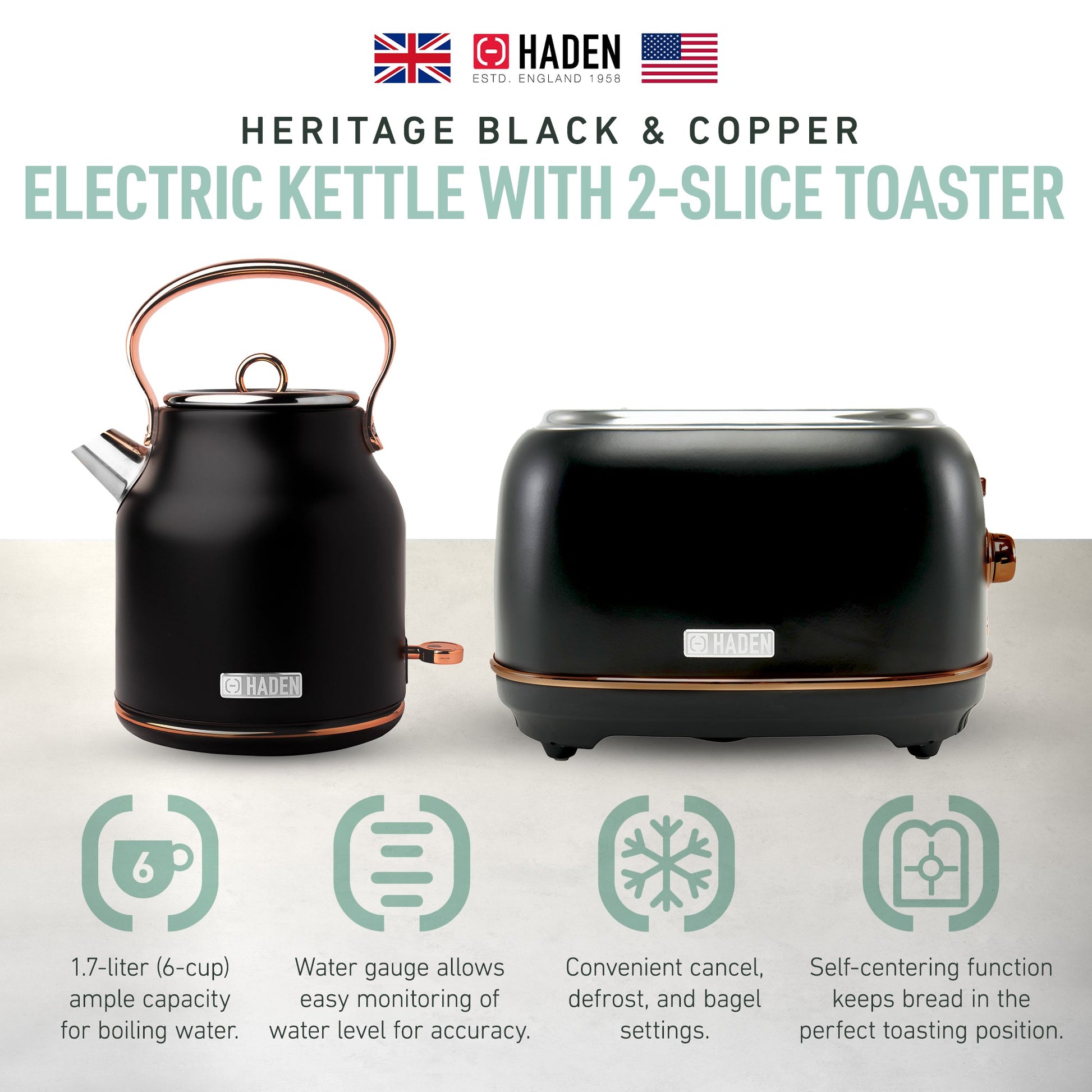Haden Heritage Electric Water Kettle & 2 Slice Wide Slot Toaster, Black & Copper