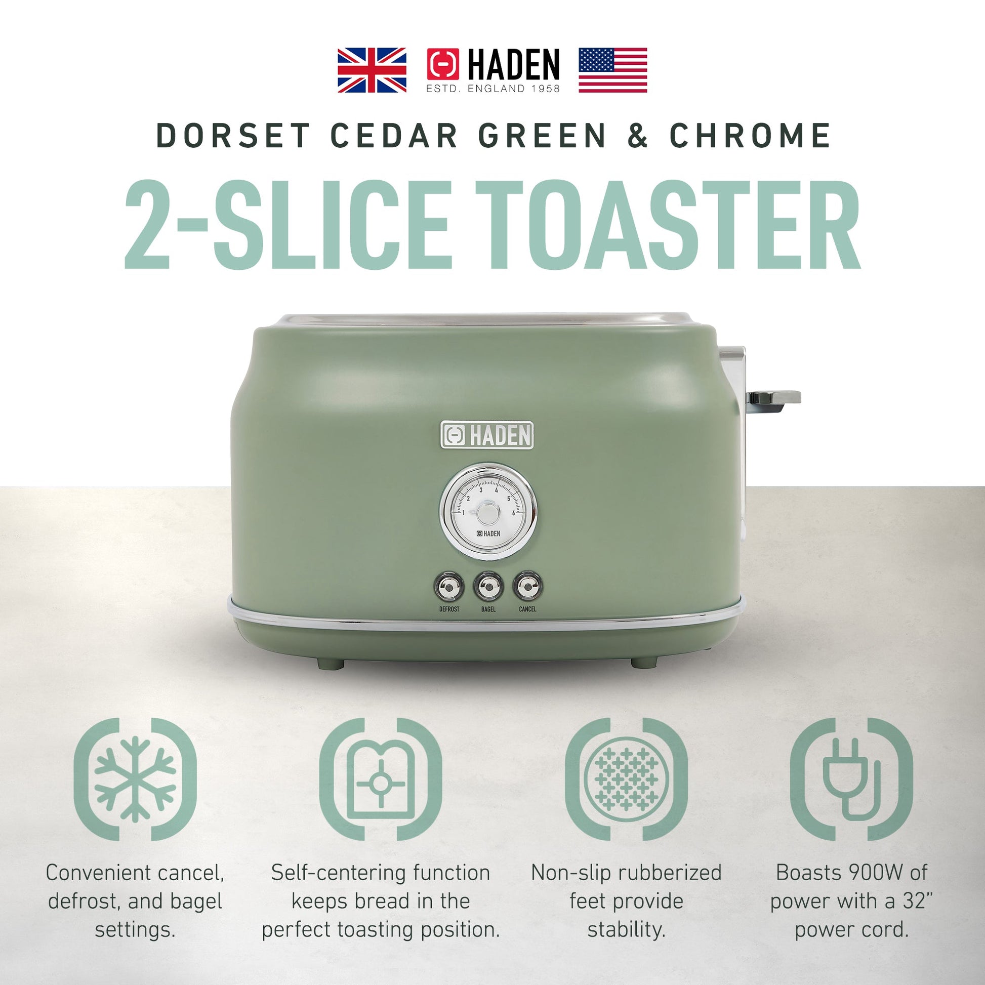 Haden Dorset 2 Slice Wide Slot Stainless Steel Toaster, Cedar Green & Chrome