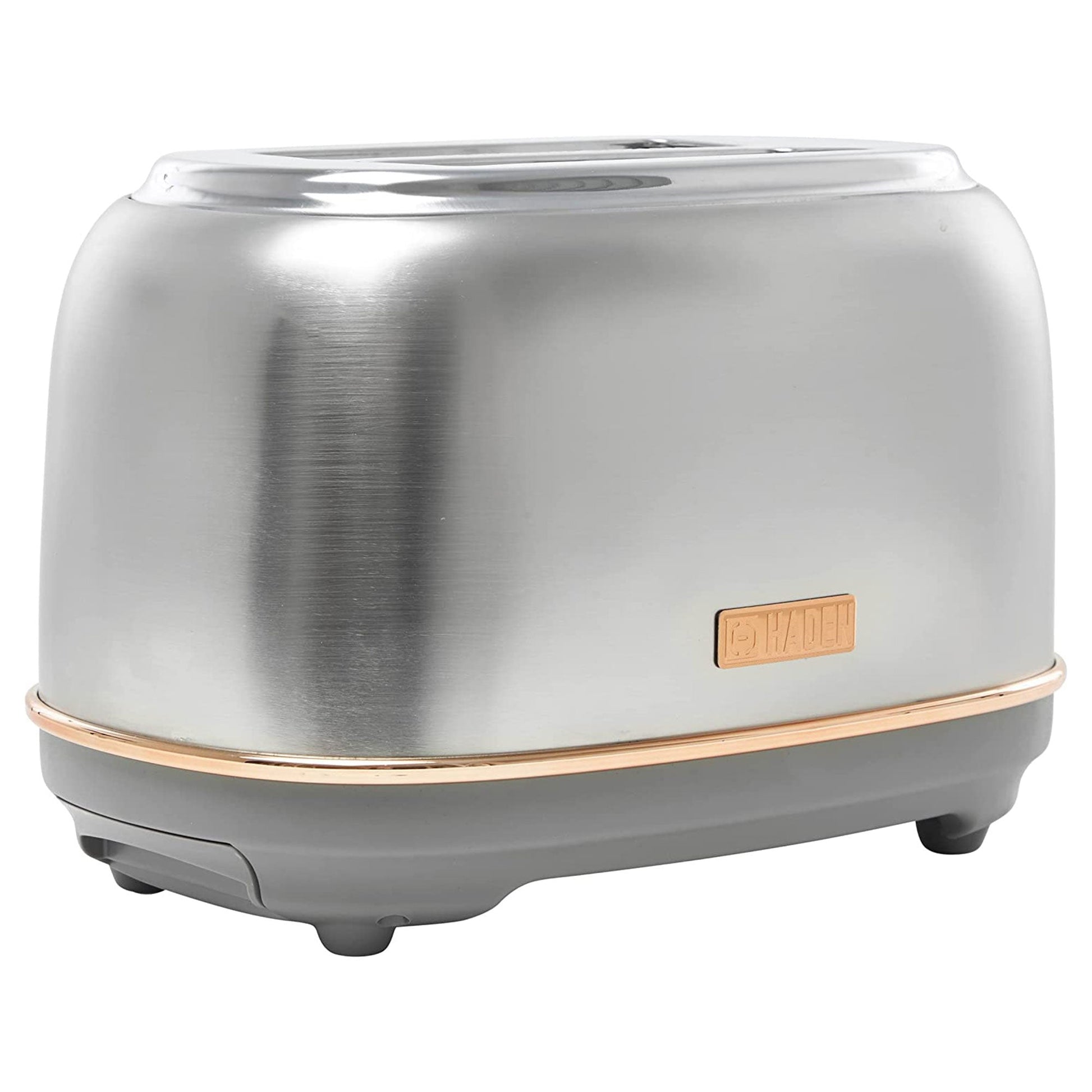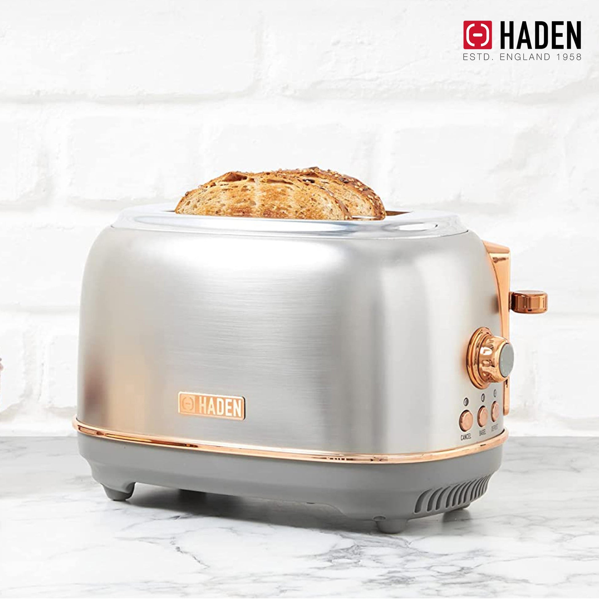 - Includes Haden Heritage 12 Cup Programmable Retro Coffee Maker and Haden Heritage 2 Slice Wide Slot Toaster, both in Steel/Copper