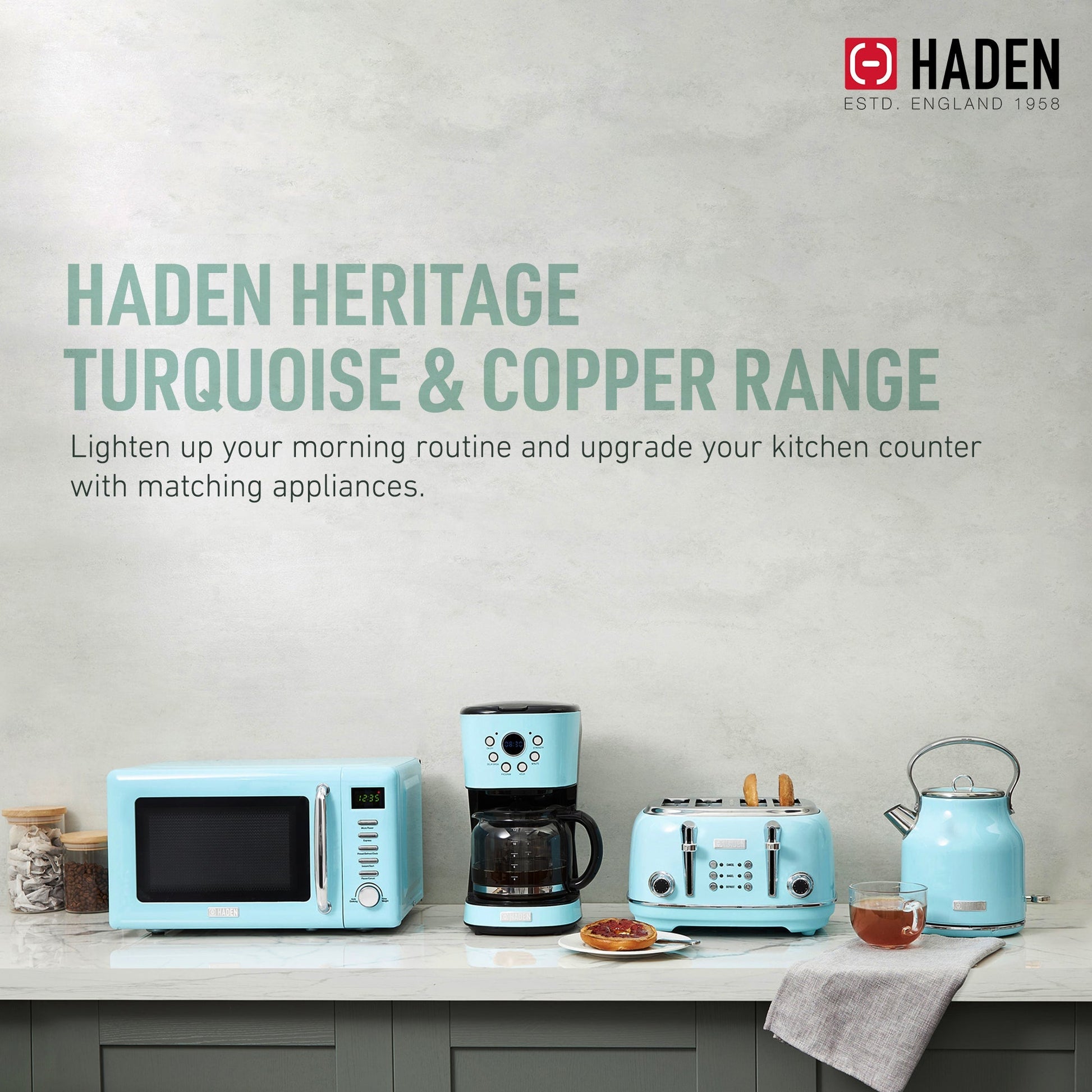 Inspired by British homes, architecture, and landscapes, this Haden electric coffee maker and Heritage kettle feature a stand-out Turquoise & Chrome color scheme.