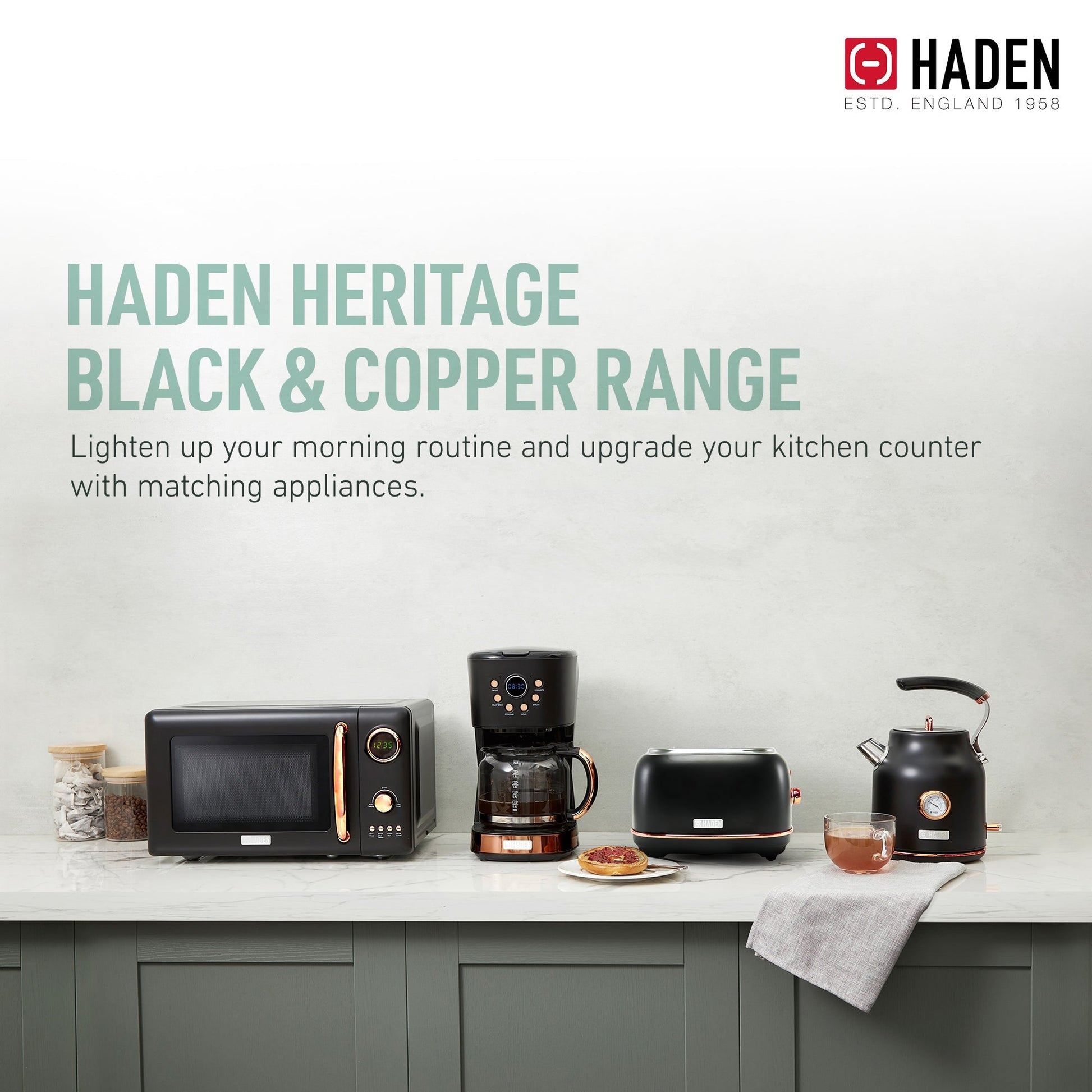 Inspired by British homes, architecture, and landscapes, this Heritage toaster and Haden electric coffee maker feature a chic Black & Copper color scheme.