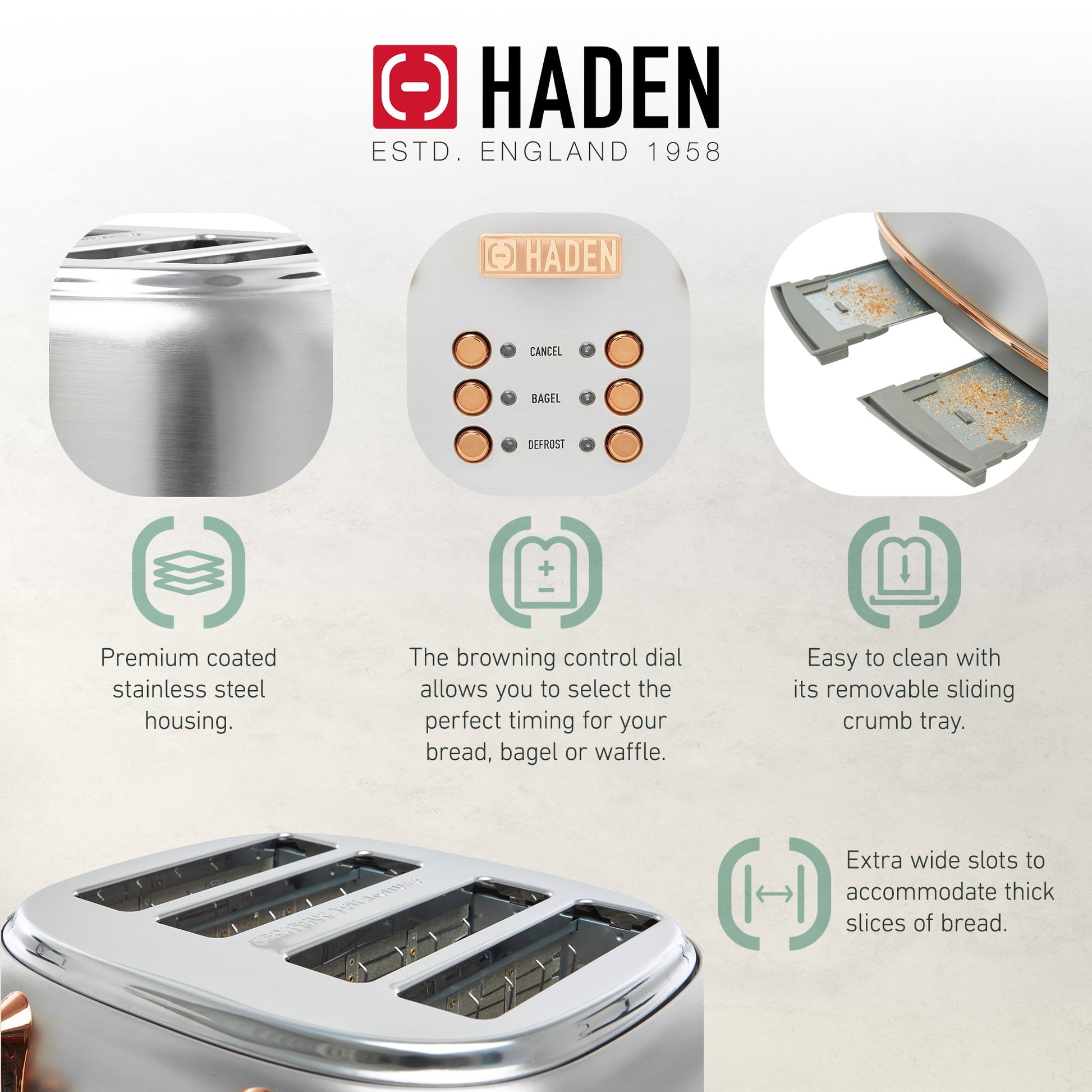 - Offering quintessential British designs, Haden creates elegant appliances with innovative technology, and is trusted by customers as the Go-to British Breakfast Brand. Taking inspiration from British homes, architecture, and landscapes, Haden embodies a perfect balance between form and function.