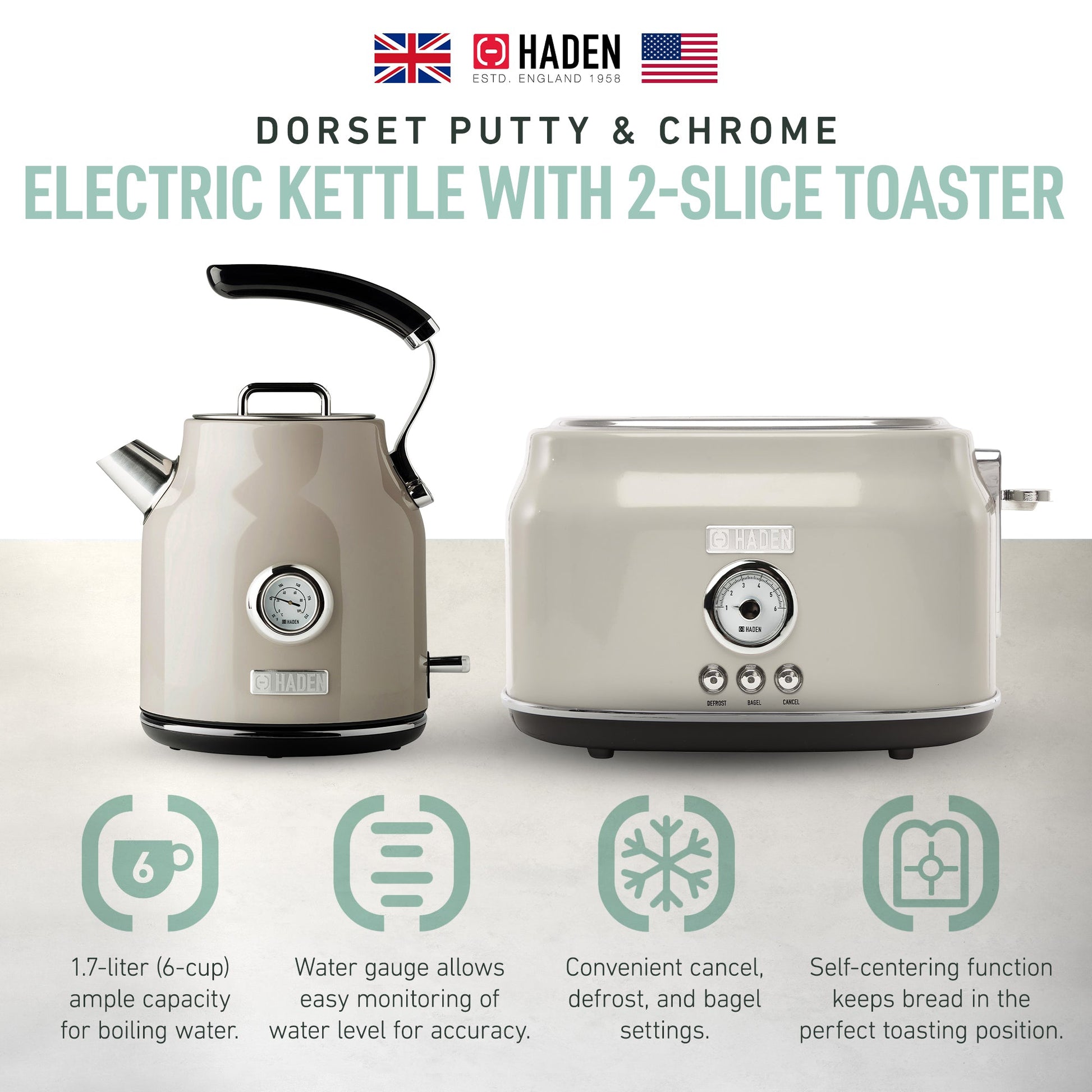 Inspired by British homes, architecture, and landscapes, this Haden Dorset toaster and kettle feature a chic Putty & Chrome color scheme.