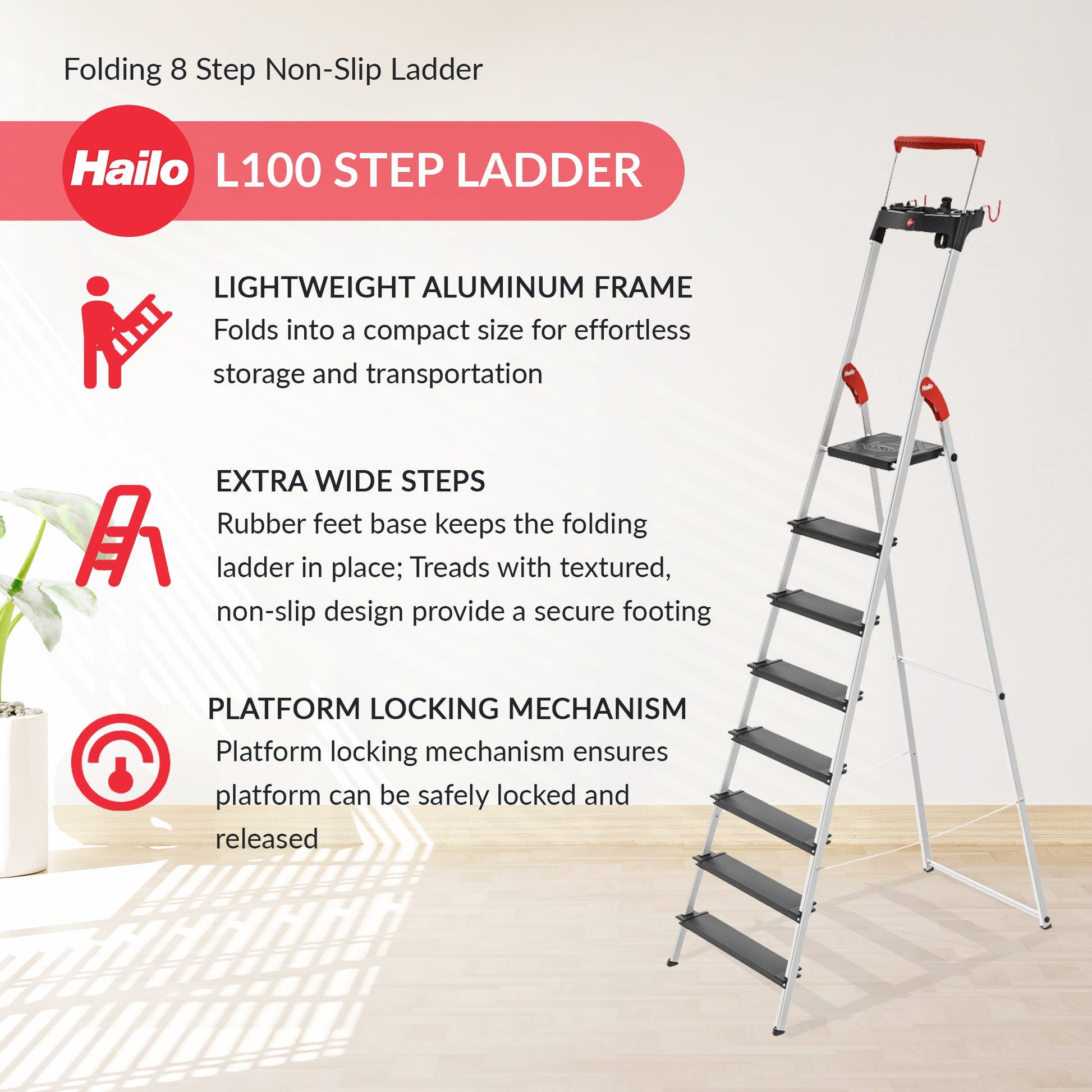 Hailo Folding 8 Step Non-Slip Ladder for Home & Kitchen, L100, Silver/Black