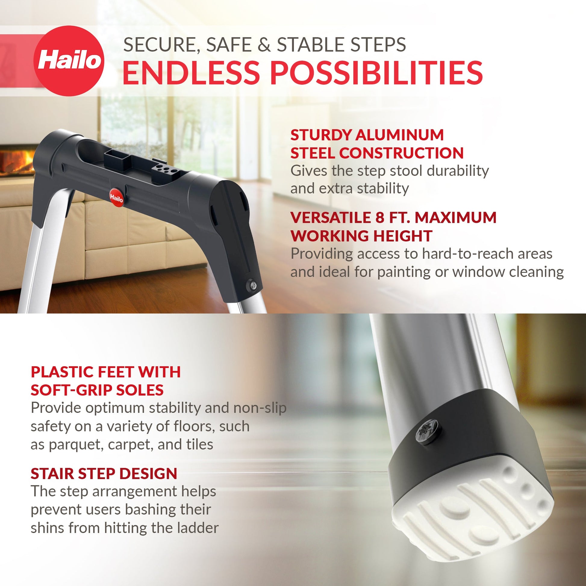 Hailo Folding Step Stool, 2 Step Ladder w/Tray for Home & Kitchen, K100, Silver