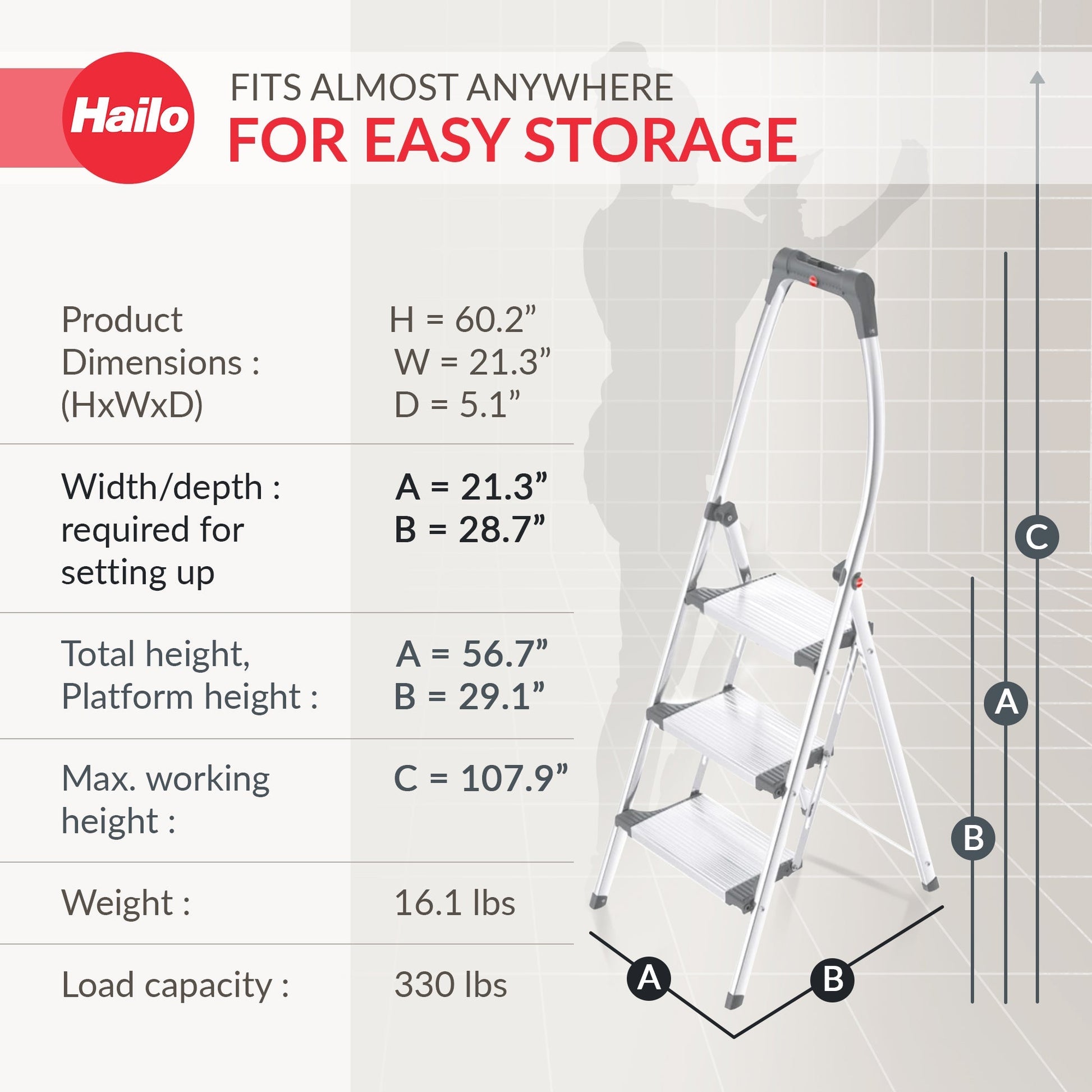 Hailo Folding Step Stool, 3 Step Ladder w/Tray for Home & Kitchen, K100, Silver
