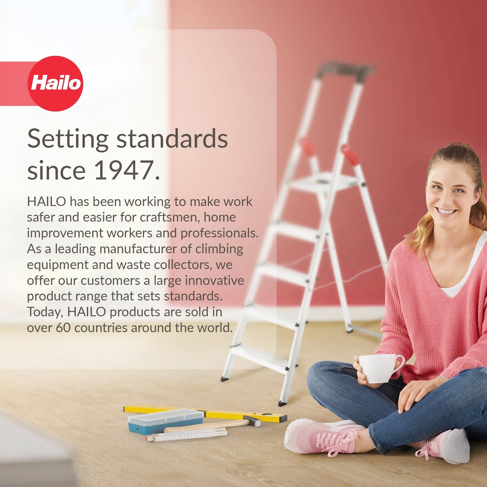 Reach those hard-to-get places and do it with confidence using the Hailo L60 Step Ladder. This stepladder is suitable for a variety of uses, with sturdy aluminum construction and a galvanized steel platform. With the patented HAILO hinge protection, the ladder hinges are kept free from dirt, ensuring lasting durability.