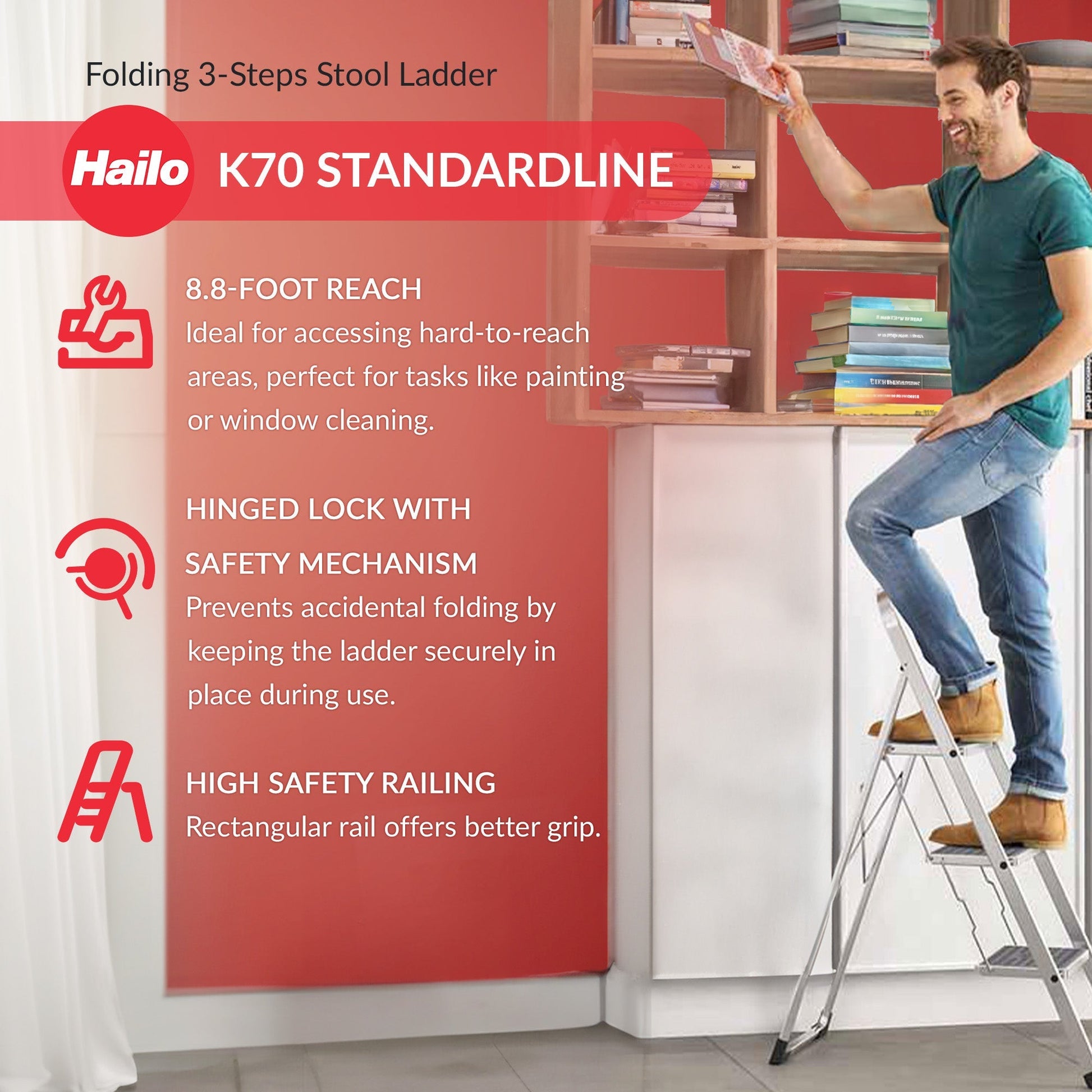 Hailo Folding Step Stool, Non-Slip 3 Step Ladder for Home & Kitchen, K70, Silver