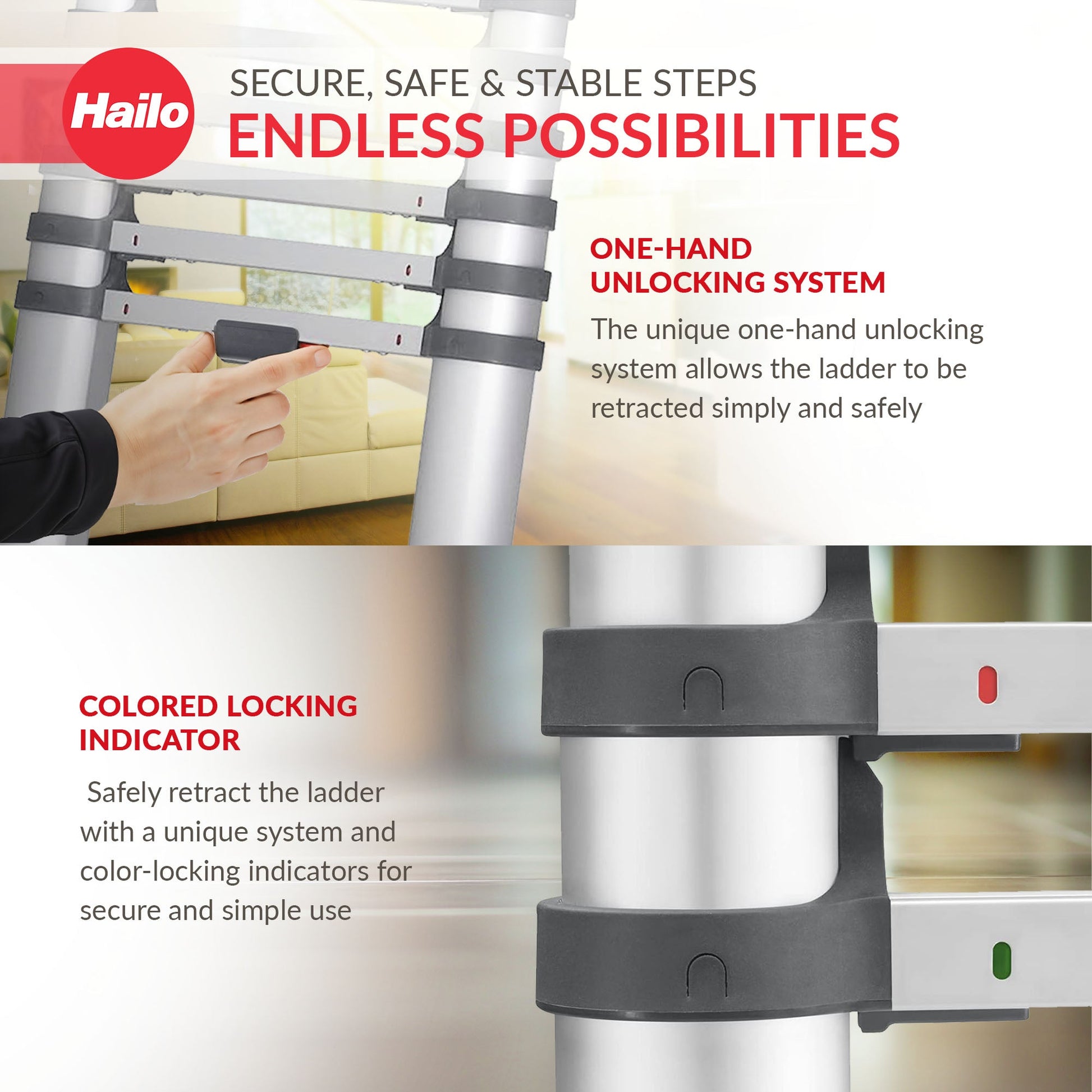 Reach new heights confidently with the Hailo Telescoping Ladder. Designed for versatility and ease, this lightweight yet durable ladder is your go-to solution for home improvement, maintenance, and outdoor projects. Whether you’re cleaning gutters, painting walls, or accessing attic storage, its telescoping design offers customizable height to suit any task.