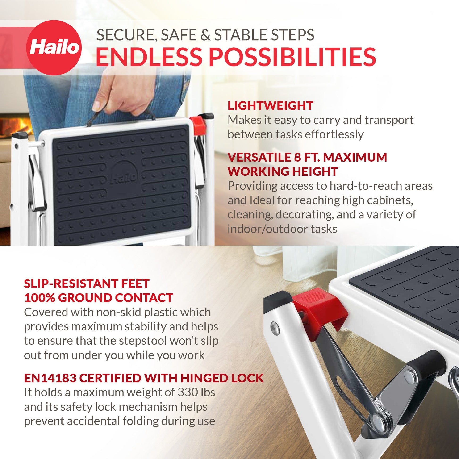 Hailo MK60 Mini Steel Step Stool with Anti-Slip Stairs & 330 lbs Capacity, White