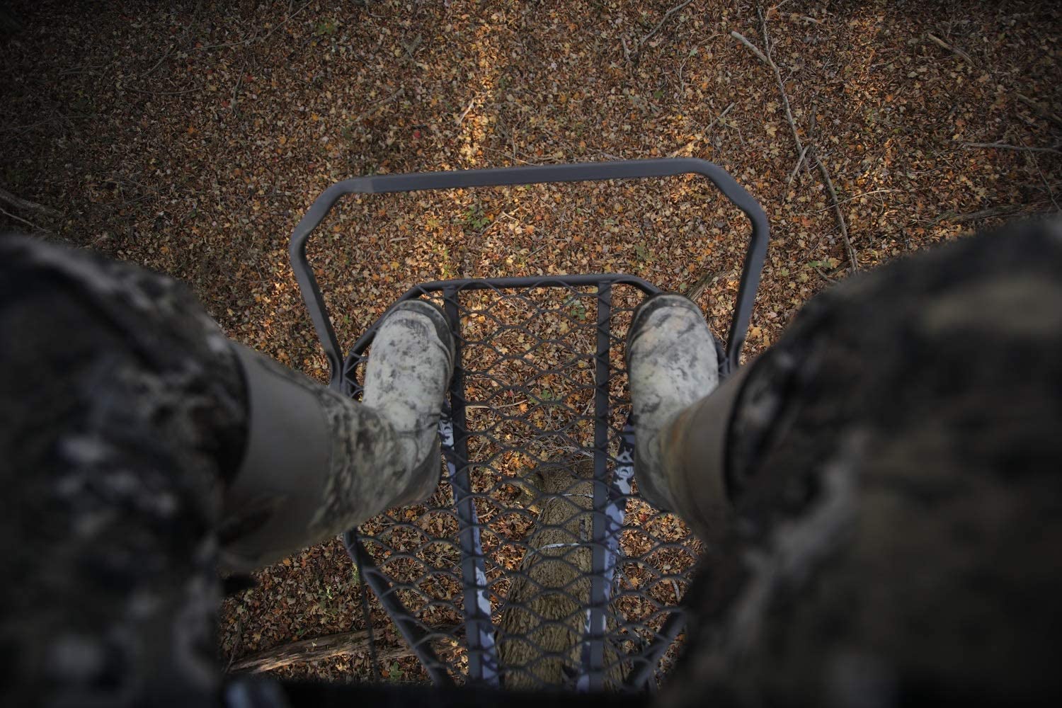 An added footrest extends past the platform for extra leg extension. The oversized grip-mesh platform boasts four levels of adjustment, so you can get the level of comfort and functionality you need for your style of hunting. The heavy-duty steel construction with textured powder coating provides seasons of reliable use, while silent over-molded attachment hooks and PTFE washers keep noise to a minimum.