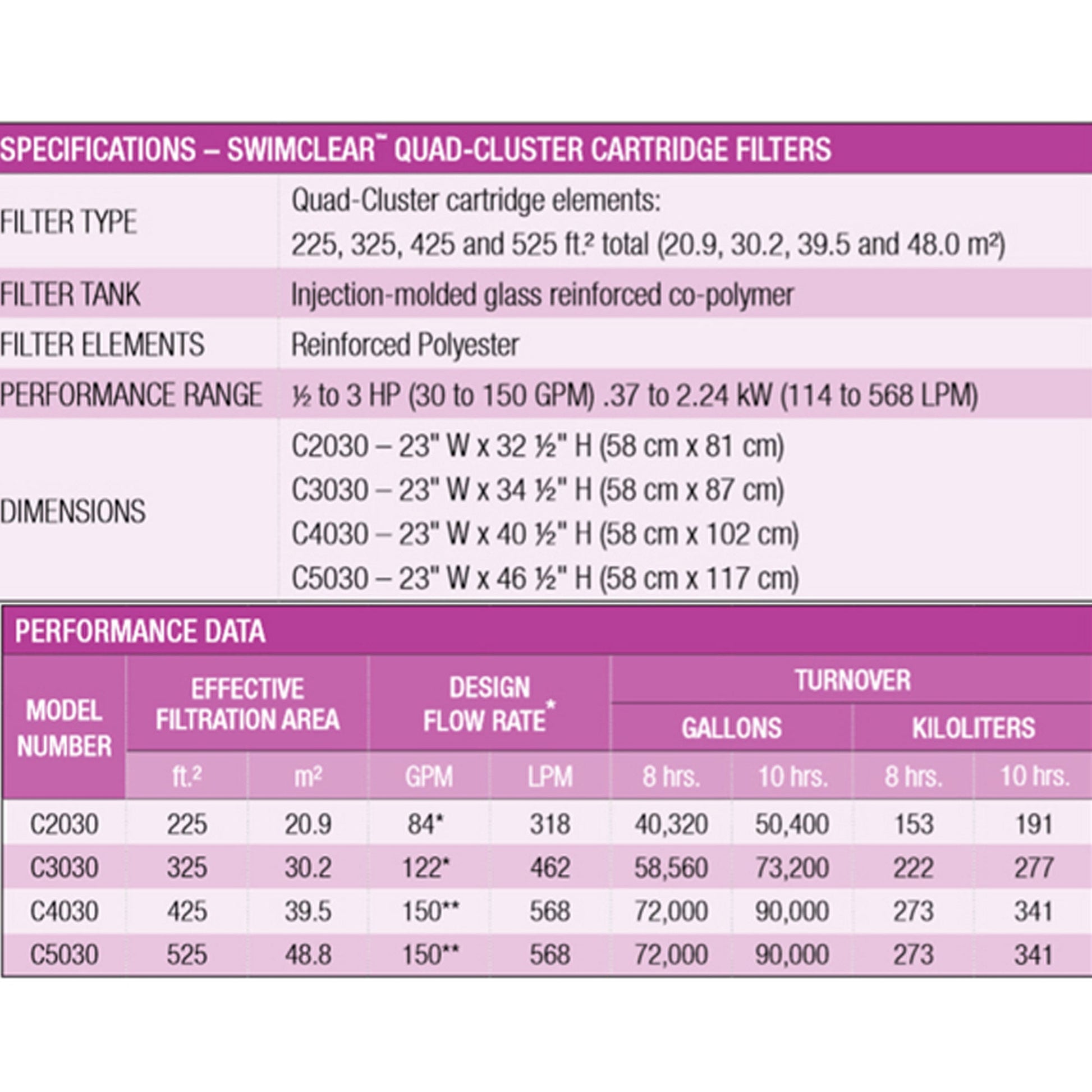 - SwimClear Cartridge with top manifold configuration provides filtration and excellent hydraulic performance