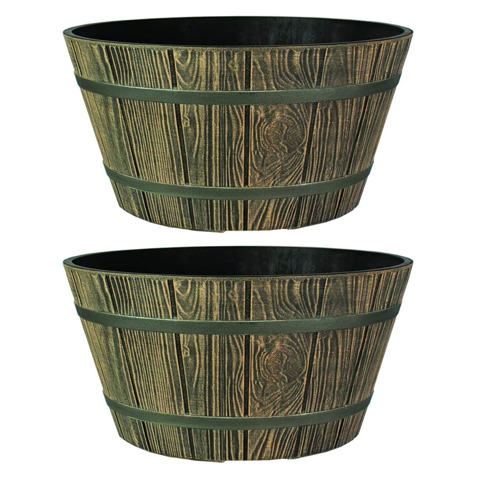 Infuse a nostalgic ambiance and include a vintage, antique look in your home decor while adding life to your surroundings using this 2-pack of Aged Wooden Oak Round Whiskey Barrel Planter by HC Companies.