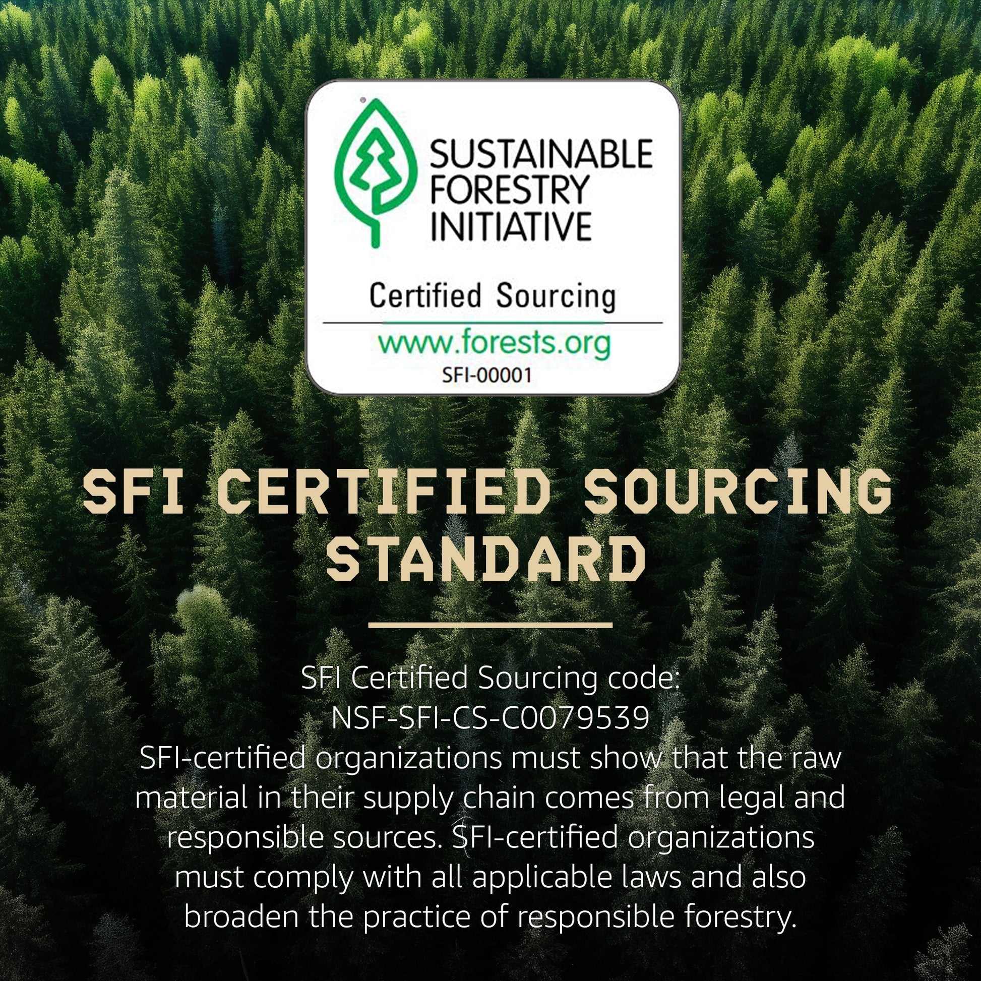 The following items abide by the "SFI Certified Sourcing Standard" and are produced by a "primary manufacture of lumber and engineered wood products." SFI Certified Sourcing code: NSF-SFI-CS-C0079539 SFI‑certified organizations must show that the raw material in their supply chain comes from legal and responsible sources. SFI-certified organizations must comply with all applicable laws and also broaden the practice of responsible forestry.
