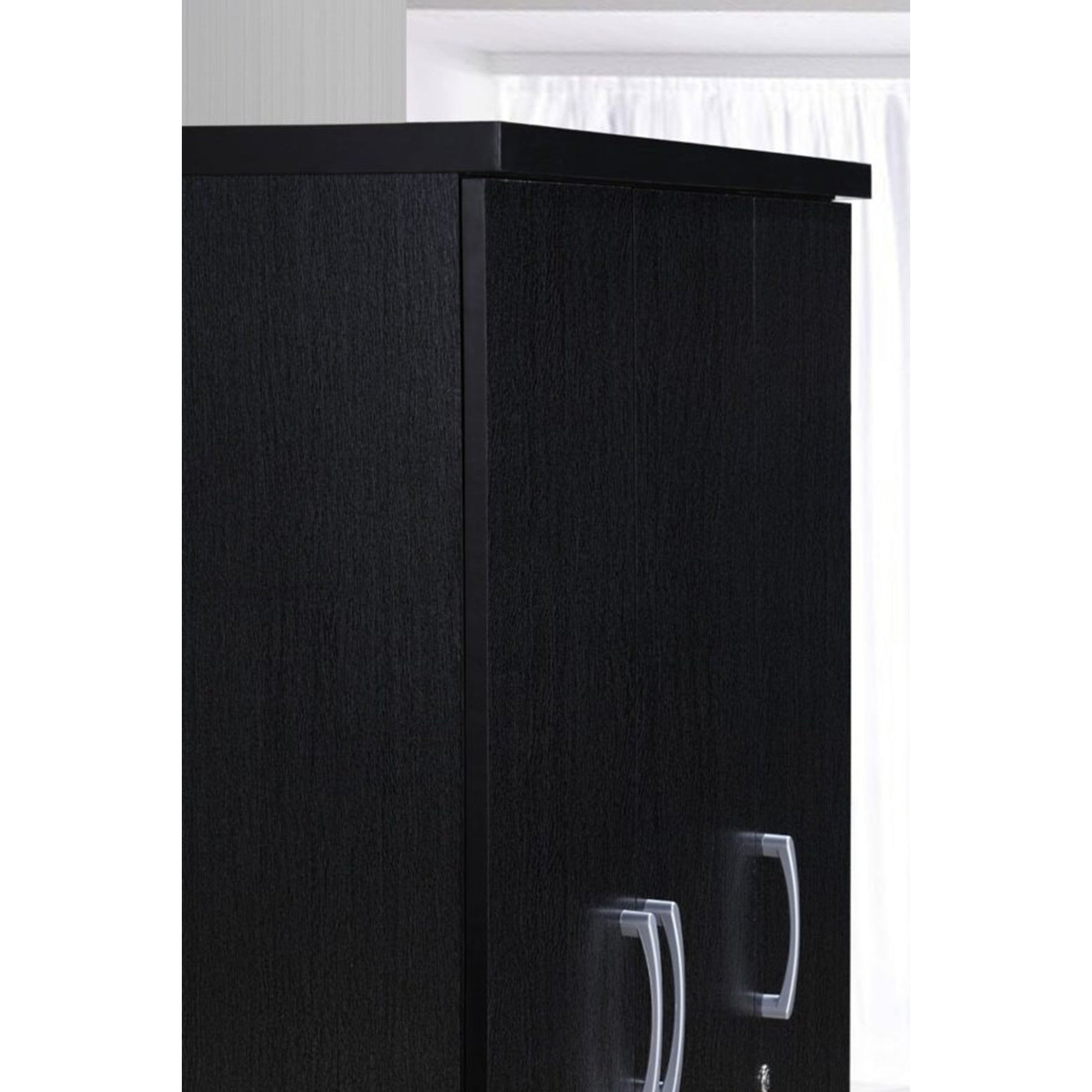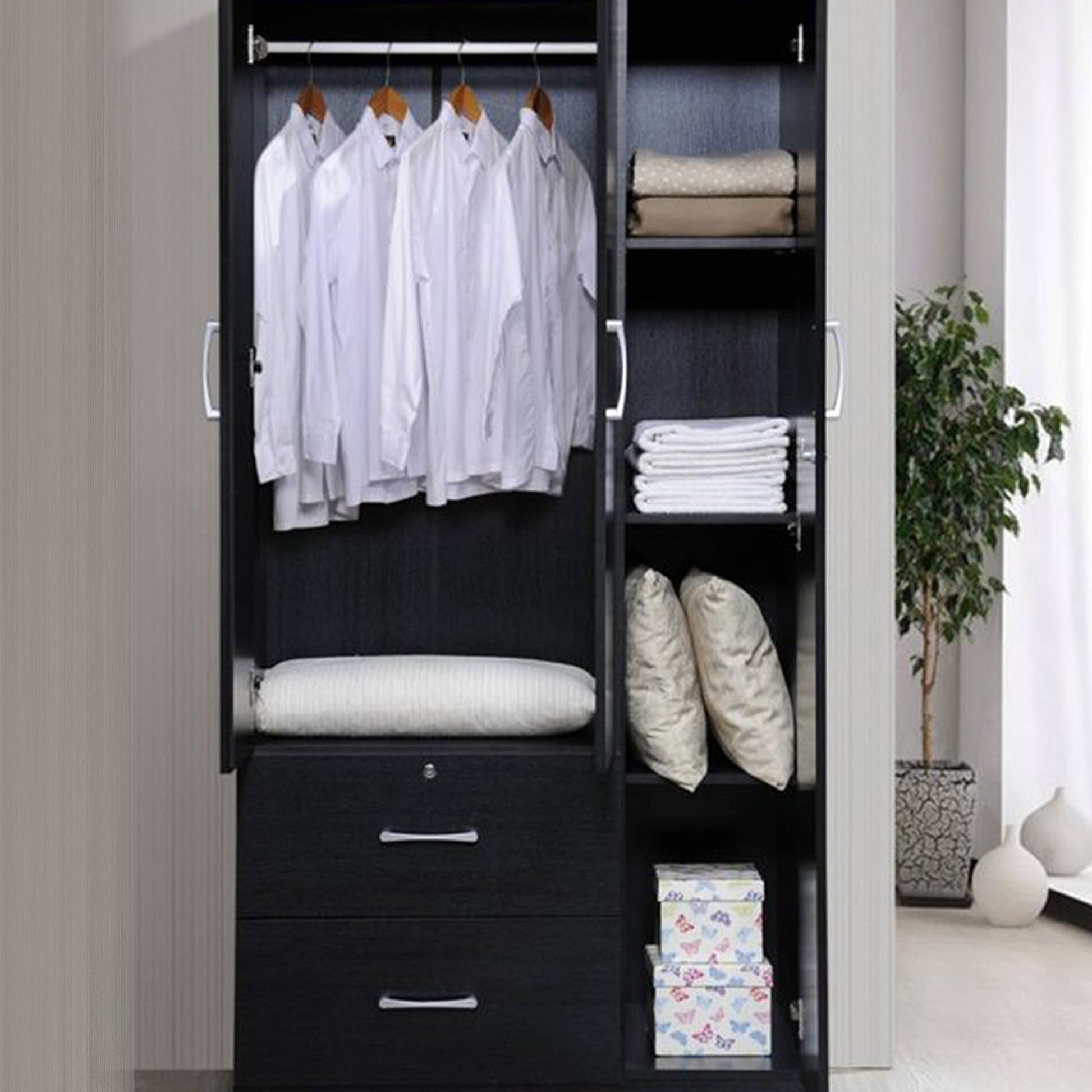 The 3 shelves are the ideal place to store accessories, handbags, additional clothing, or even baskets or bins of various items from sunglasses and hats to wallets, belts, tights, and everything in between. Keep your valuable or sentimental personal items safe and secure in the top drawers that include a sturdy locking mechanism, providing you with added peace of mind. Designed to stylishly hold your entire wardrobe, this armoire is made to blend in seamlessly with any existing decor making it a simple and quick addition to your space.