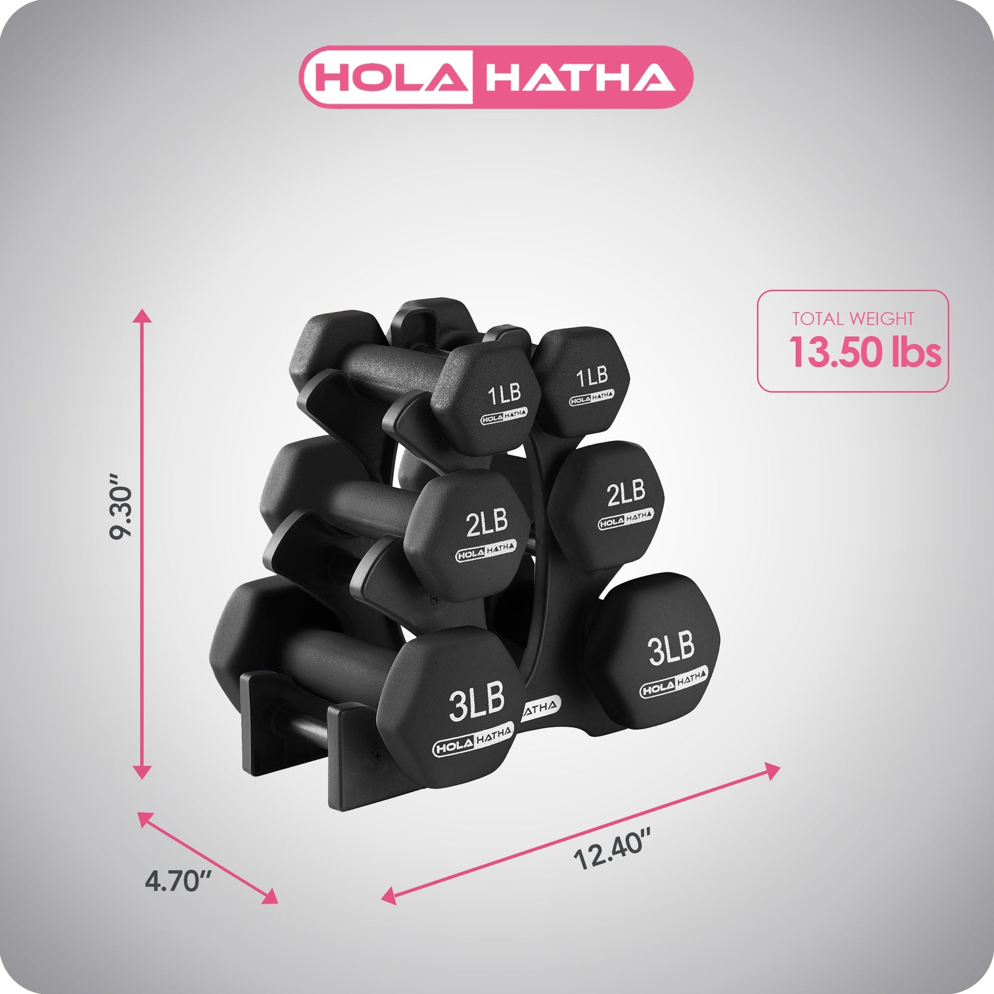 HolaHatha Dumbbell Set includes a pair of 1, 2, and 3-pound weights plus a convenient storage stand to keep your workout equipment organized. The weight range allows you to customize your workouts to suit your fitness level and fitness goals. The dumbbell set with rack is excellent for resistance training and strength training for fitness enthusiasts of all levels.