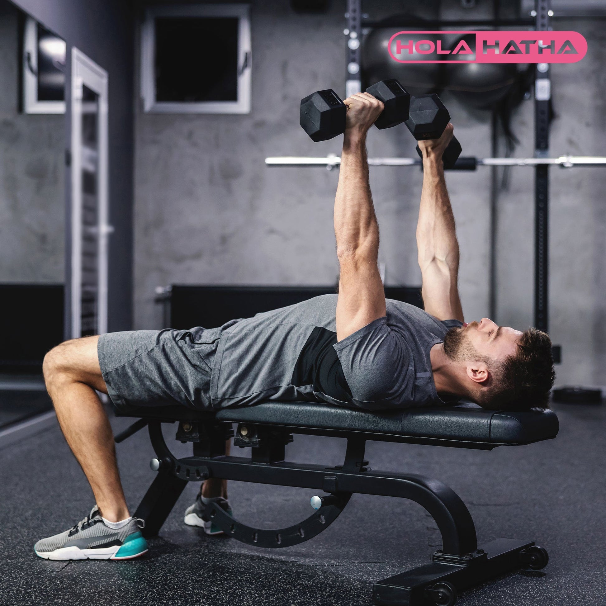 Take your exercise routine to the next level and challenge yourself with the HolaHatha 10, 15, 25, 30, and 35-pound Hexagon Dumbbell Free Hand Weight Set with Storage Rack in Black.
