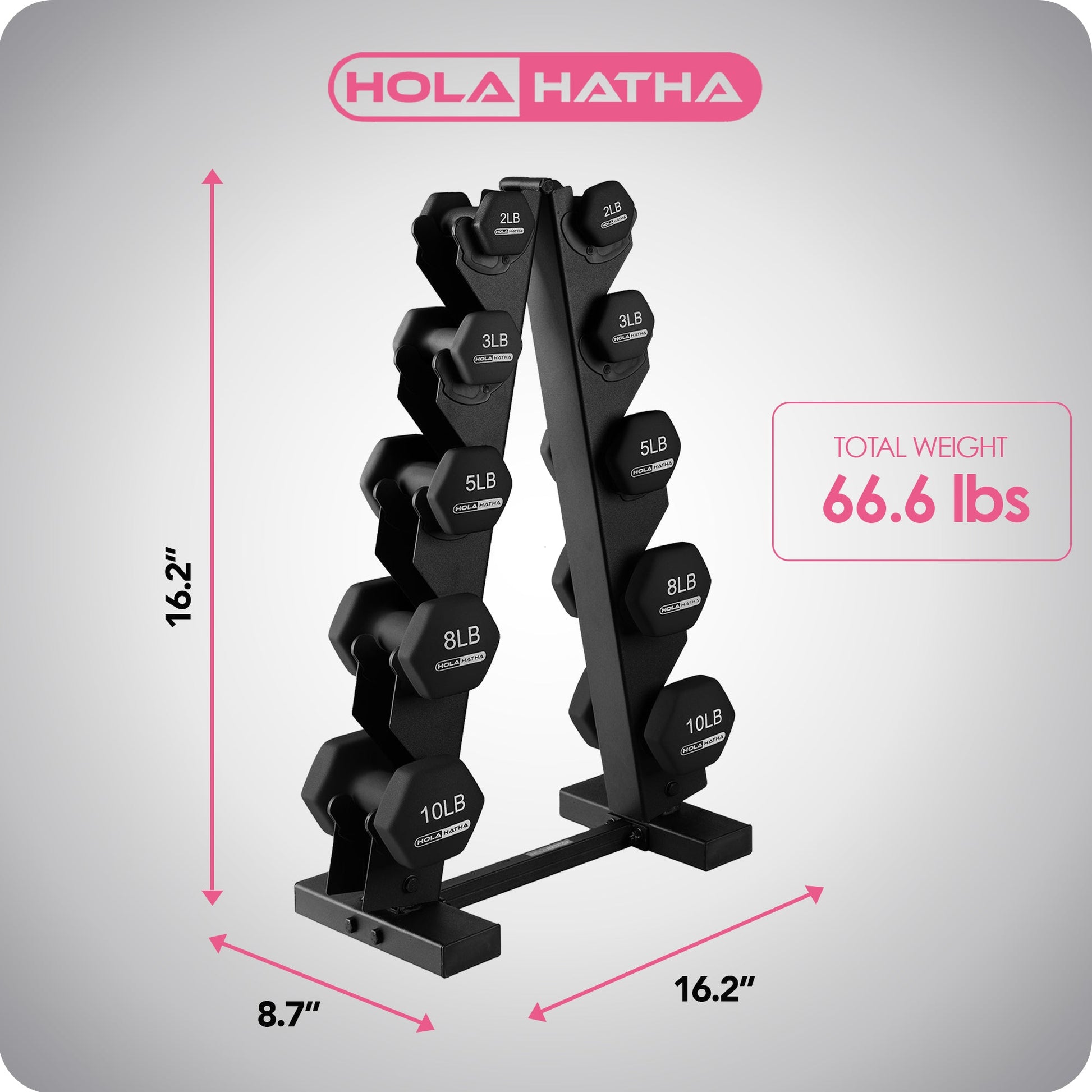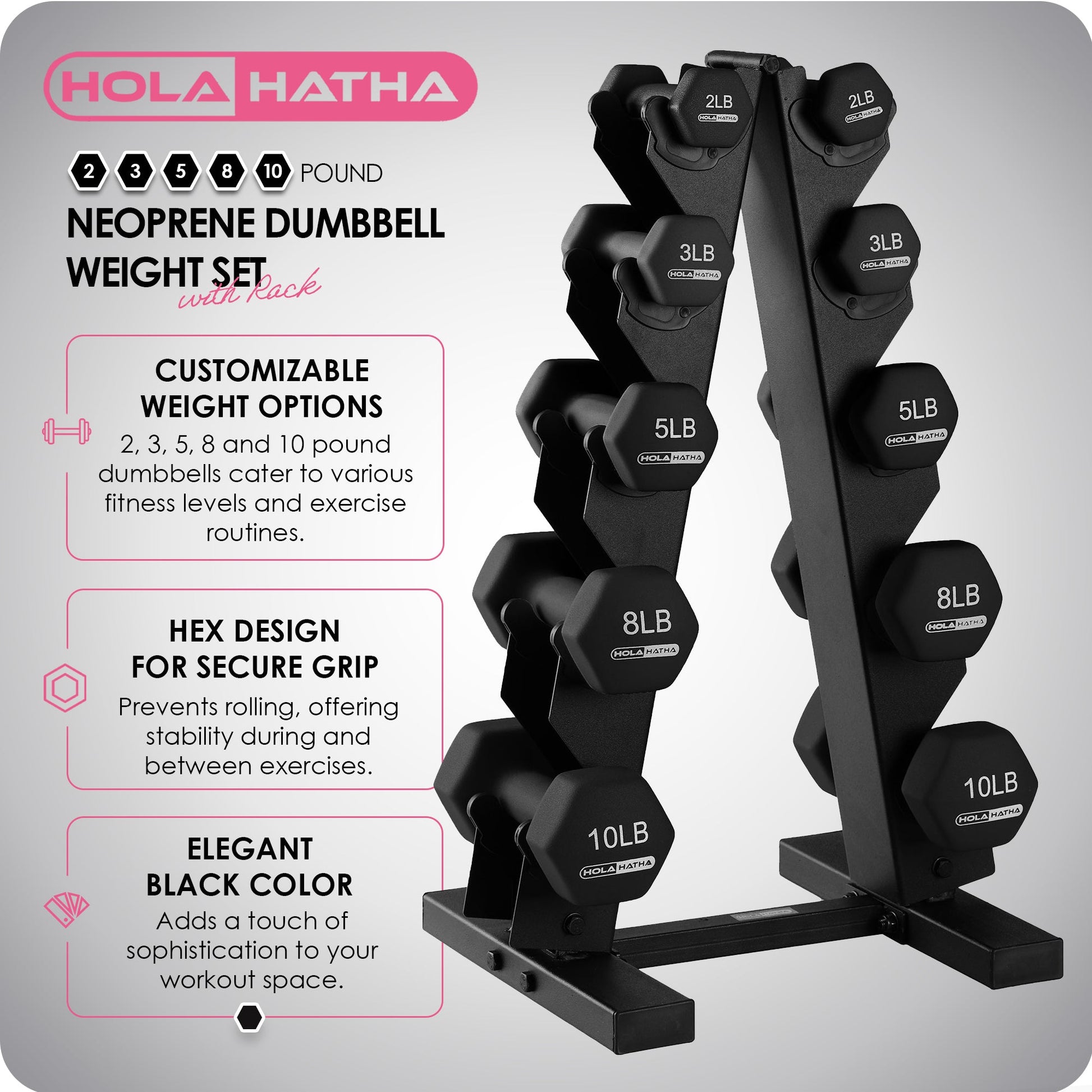 HolaHatha 2, 3, 5, 8 & 10 Pound Neoprene Dumbbell Weight Set with Storage Rack