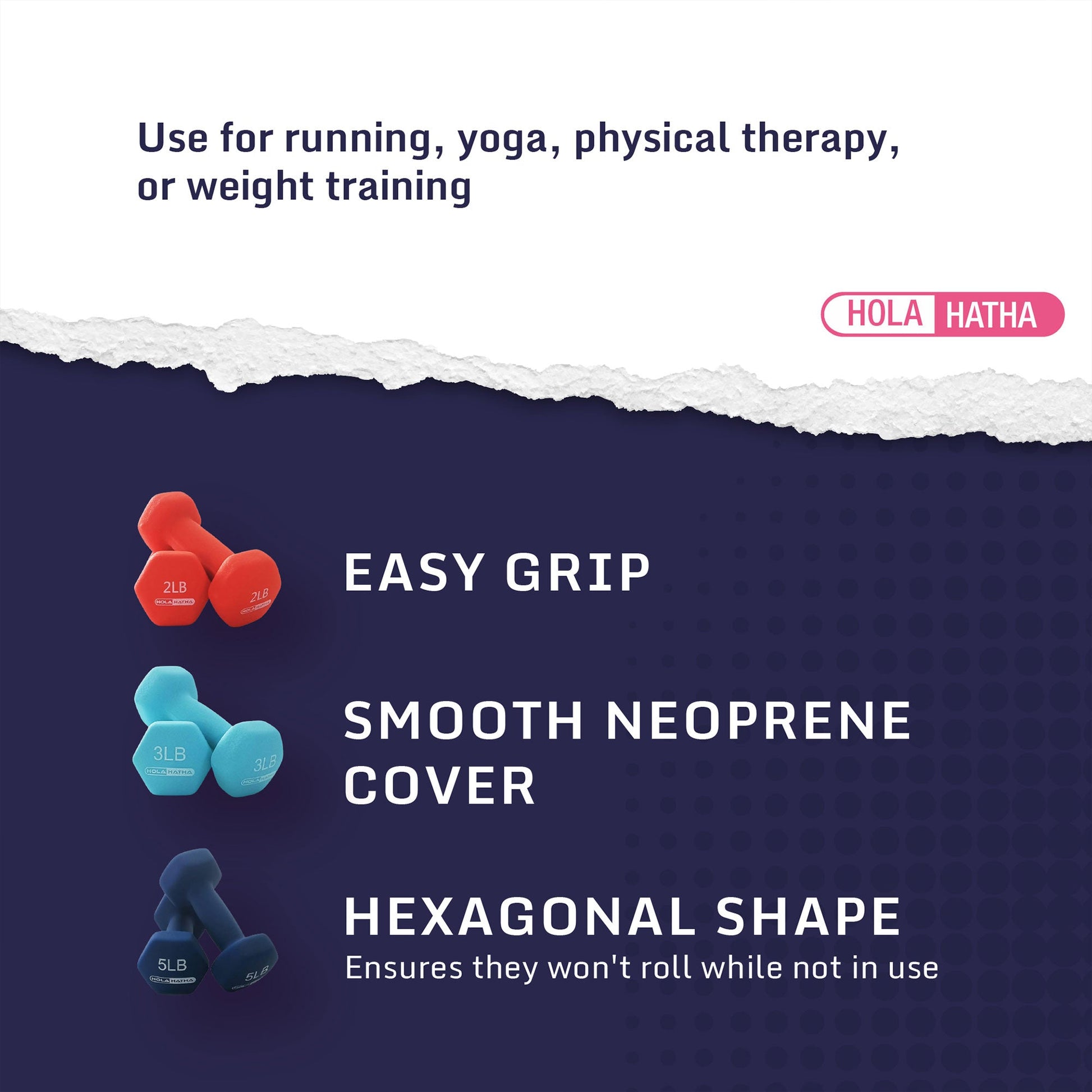 Adding these dumbbells to your exercise routine is a step towards a stronger, healthier, and more confident you. The HolaHatha Neoprene 2, 3, and 5-Pound Hand Dumbell Set will help you reach your fitness goals.