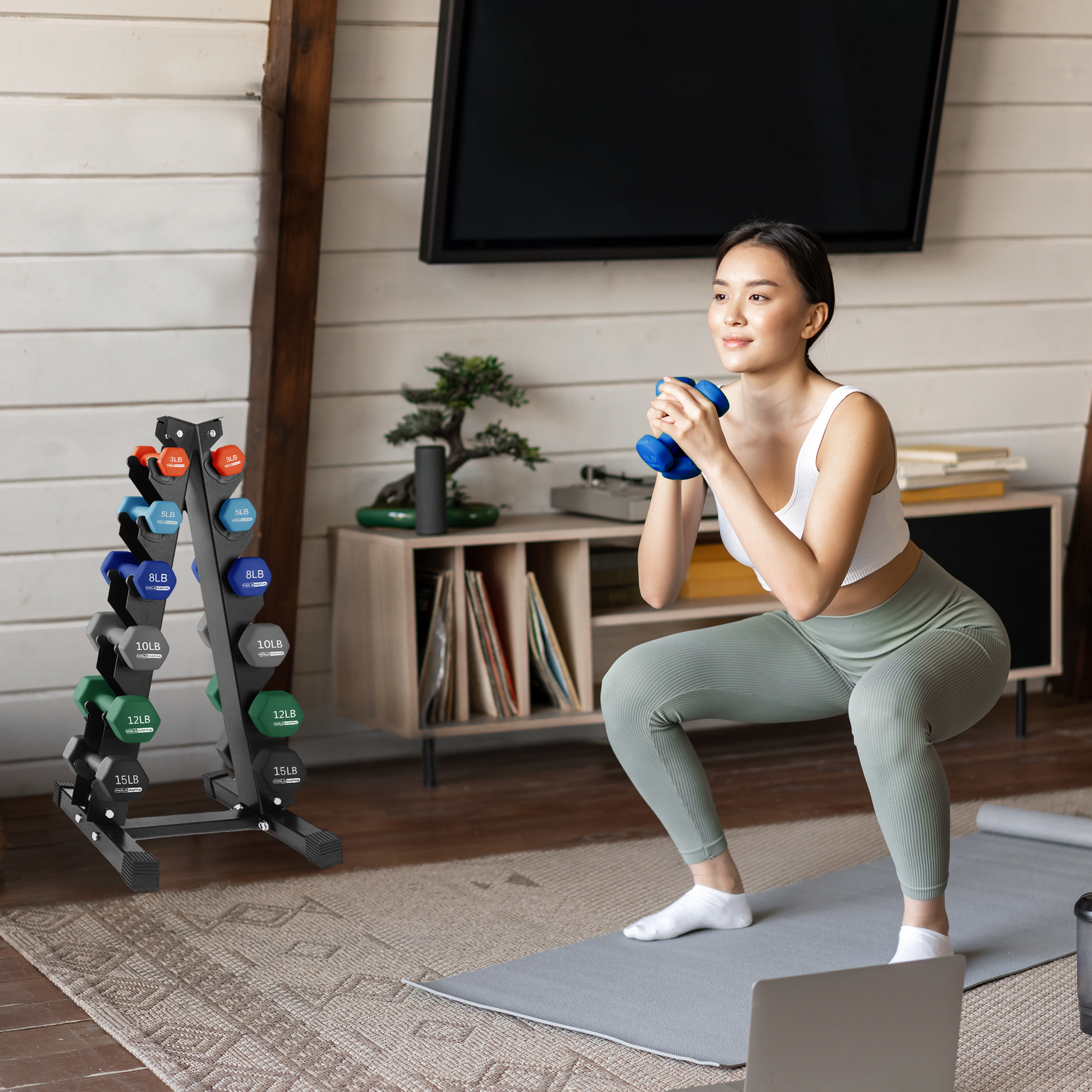 HolaHatha 3, 5, 8, 10, 12 & 15 Pound Neoprene Dumbbell Weight Set w/Storage Rack