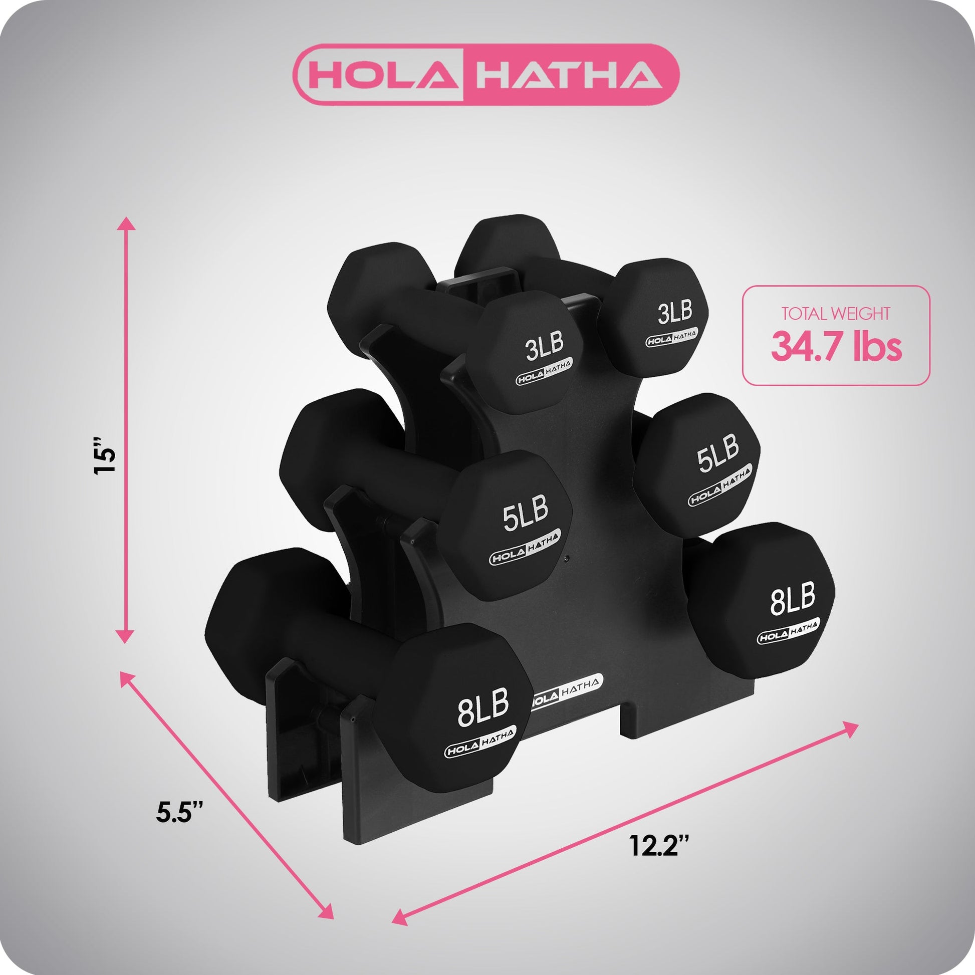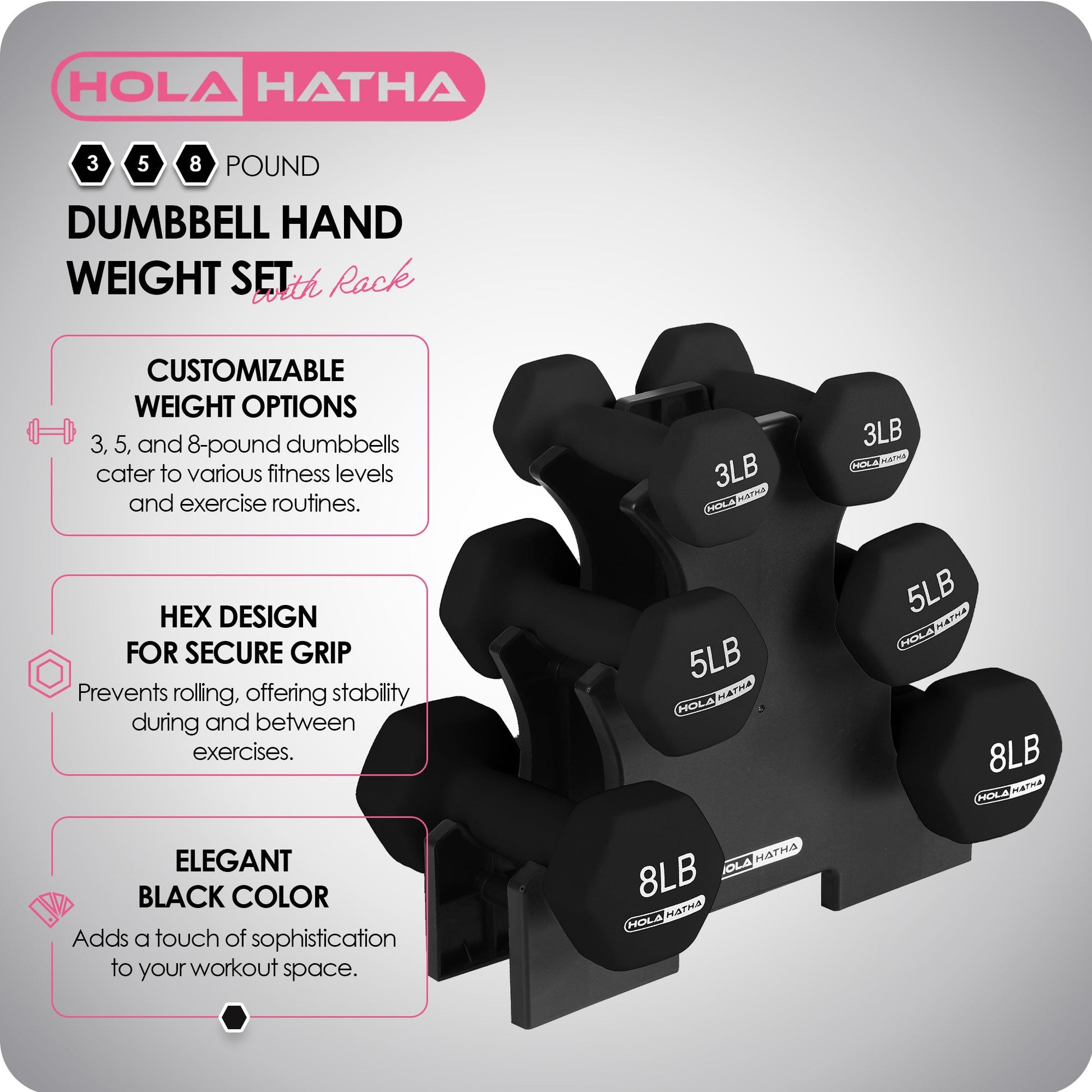 HolaHatha 3, 5 & 8 Pound Hex Dumbbell Hand Weight Set with Storage Rack, Black