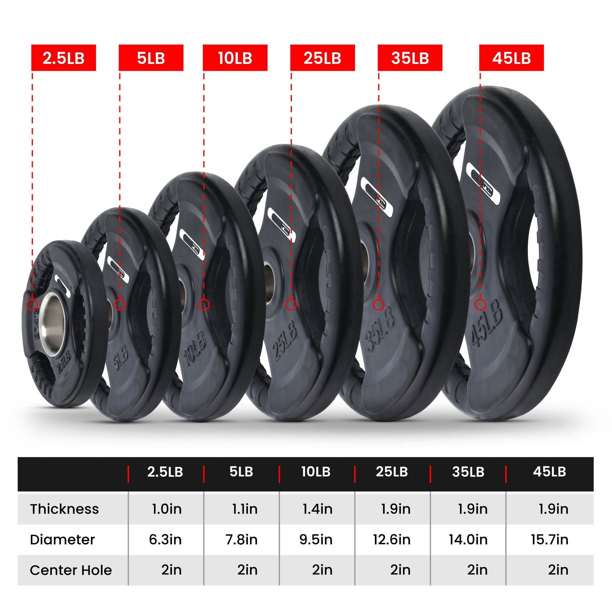 The clear labeling in pounds allows you to determine your desired weight at a glance quickly. With a 1.97-inch center hole, the plate fits Olympic-sized bars and offers a snug fit for effective performance.