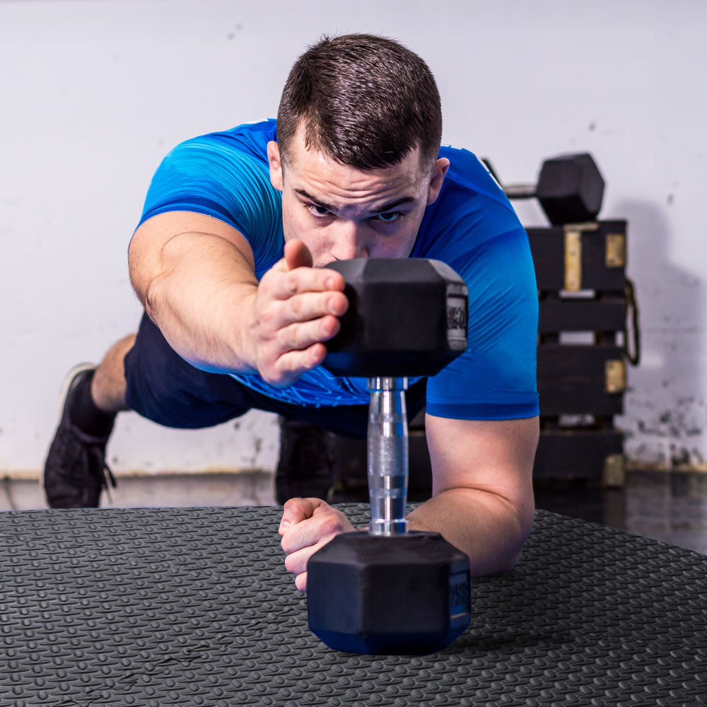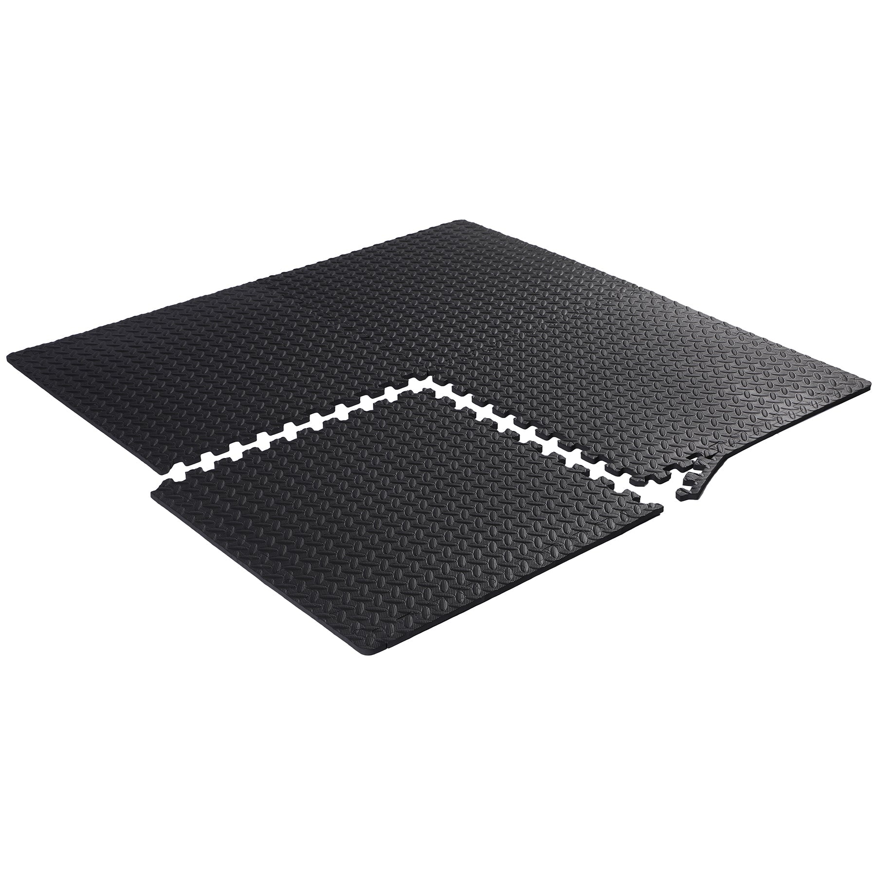 This interlocking foam workout mat set includes 6 tiles and 12 border pieces for clean edges, covering up to 24 square feet, perfect for several pieces of equipment. Made from half-inch thick EVA foam, each tile is shock absorbant, protecting the floor underneath from dropped weights and heavy equipment frames. A textured surface prevents slipping and the tiles are water-resistant.