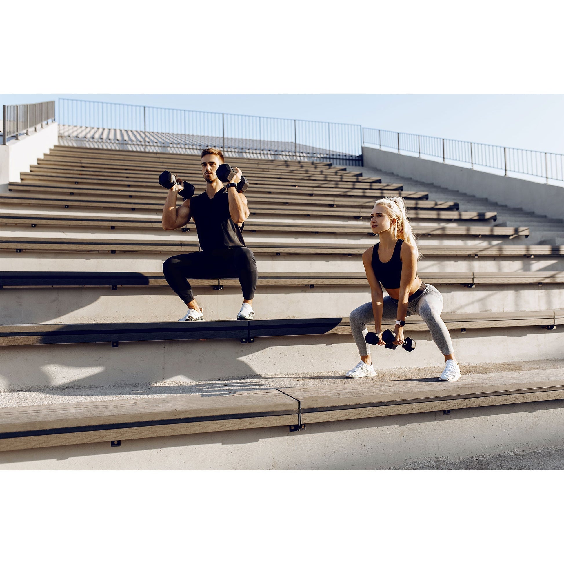 The dumbbell pair includes 2 5 pound weights that are ideal for intermediate training and bulking. With an excellent mid-range weight, the dumbbells help build muscle for those looking to bulk up, tone their body, or add some intensity to their cardio routine. Constructed from solid iron that withstands the punishment of regular workouts, the textured grips feature an elegant, contoured shape that provides you with a firm, confident, and comfortable grip during each rep. This thoughtful design not only enhances your grip but also elevates your overall workout experience, instilling a sense of assurance and control. The convenient hexagonal shape ensures the dumbbells lay flat on the ground, keeping them from rolling and allowing for easy stacking for space-saving storage.