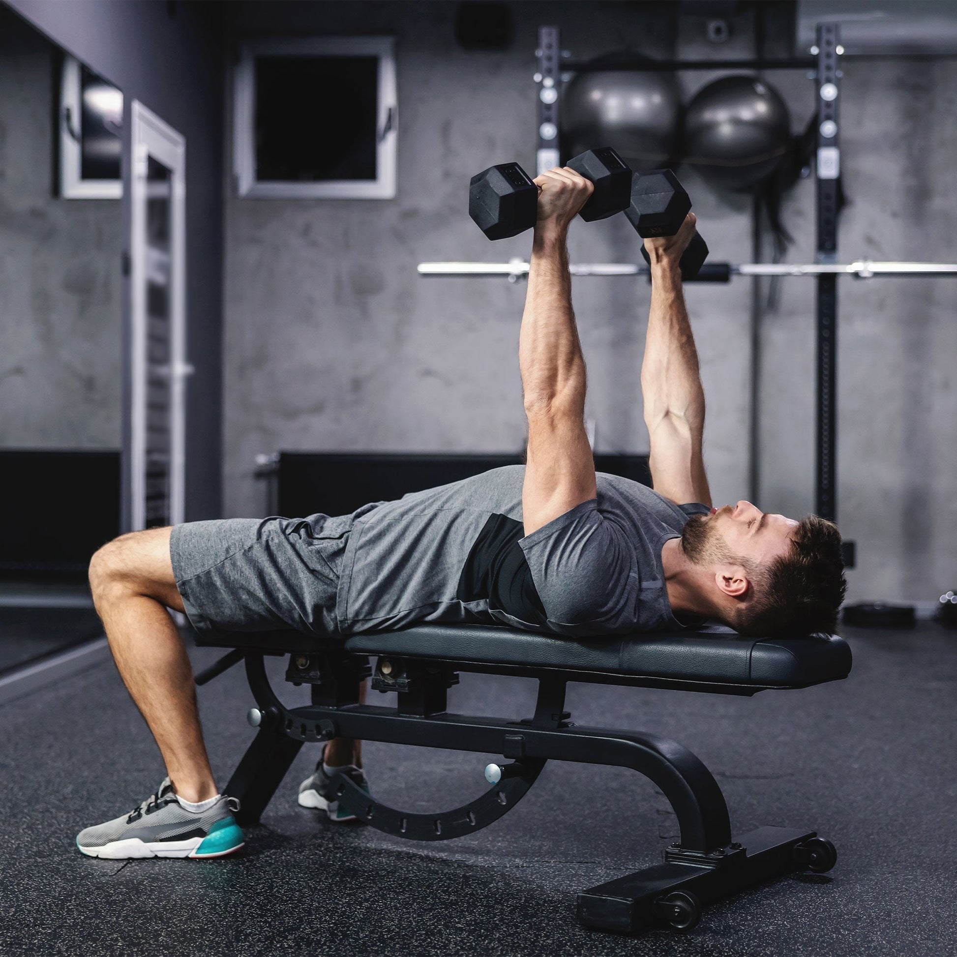 The dumbbell includes weights that are ideal for intermediate training and bulking. With an excellent mid-range weight, the dumbbell helps build muscle for those looking to bulk up, tone their body, or add some intensity to their cardio routine. Constructed from solid iron that withstands the punishment of regular workouts, the textured grips feature an elegant, contoured shape that provides you with a firm, confident, and comfortable grip during each rep. This thoughtful design not only enhances your grip but also elevates your overall workout experience, instilling a sense of assurance and control. The convenient hexagonal shape ensures the dumbbell lies flat on the ground, keeping it from rolling and allowing for easy stacking for space-saving storage.