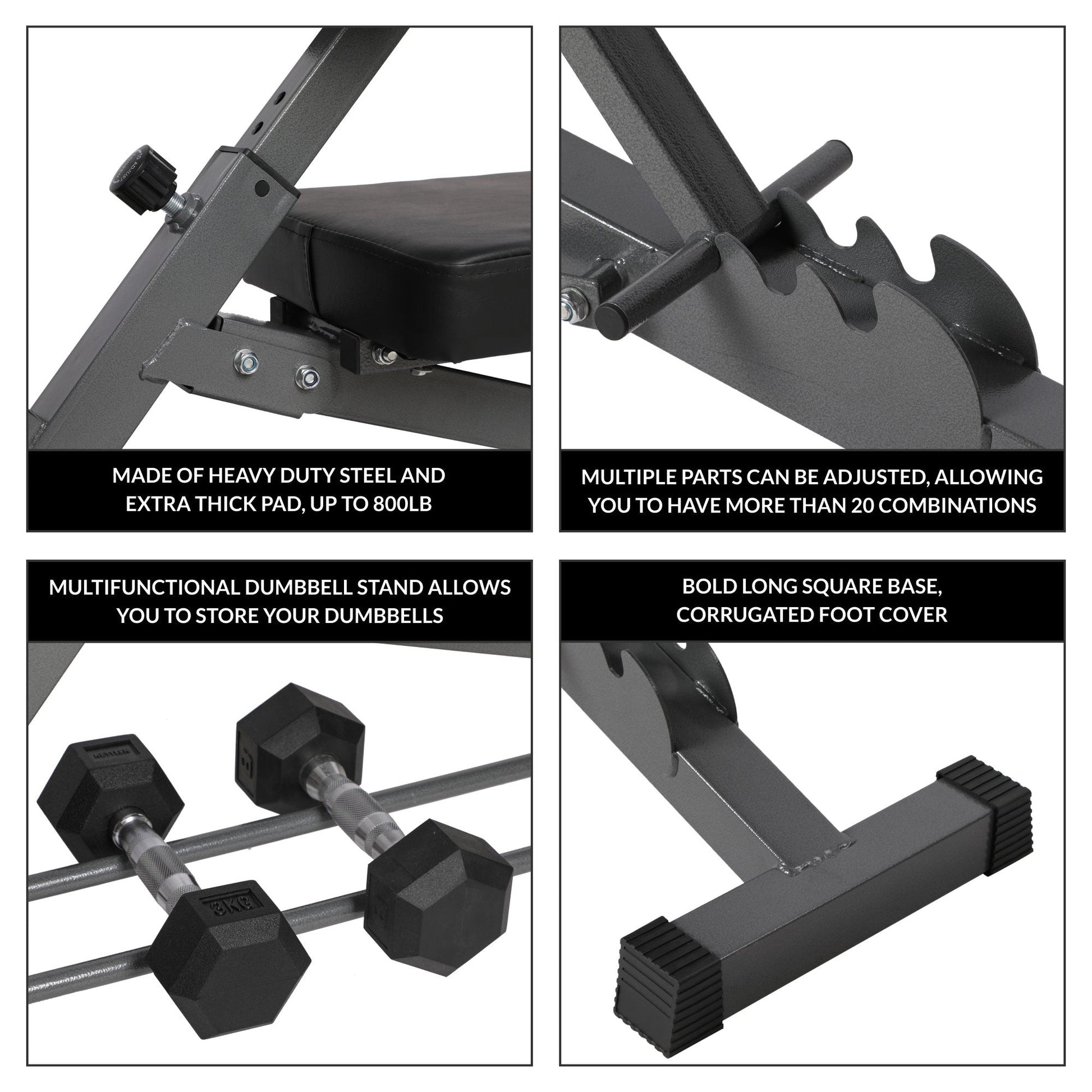 This versatile exercise bench performs the duties of a decline bench and flat bench with multiple angles with up to 20 combinations. Easily perform dumbbell exercises, situps and crunches, or pushups to tone your arms, abs, back, chest, glutes, hamstrings, and core. The durable all-steel design provides unparalleled support so you can lift confidently, and ribbed rubber feet ensure the equipment stays put as you workout. The benchtop features thick, high-density foam padding and soft vinyl upholstery that provides comfort and safety as you tone, and thigh supports and foam ankle rollers offer the ideal place for your legs to grip to ensure proper form. Different angles help you workout every part of your body to achieve your ideal look.