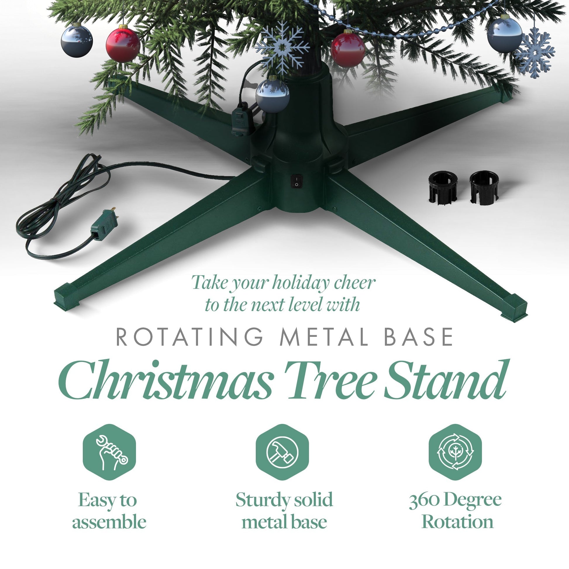 Your beautifully decorated Christmas tree deserves to be shown off. Featuring an innovative design, this stand allows for full 360-degree rotation for added holiday cheer so every side of your tree is seen. Simply plug the tree cord into the base and plug the base cord into the outlet for easy use. This tree stand is crafted from durable metal for lasting strength and provides convenient storage in your home or garage when the holidays are over.