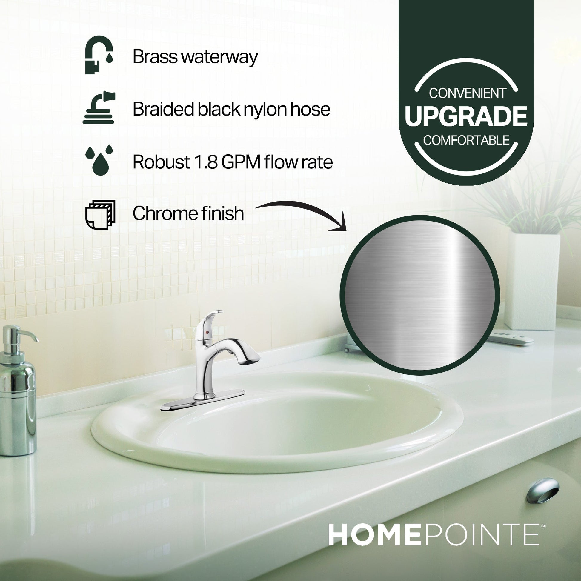 - With a robust 1.8 GPM flow rate and a ceramic disc cartridge, ensuring a steady and reliable water stream