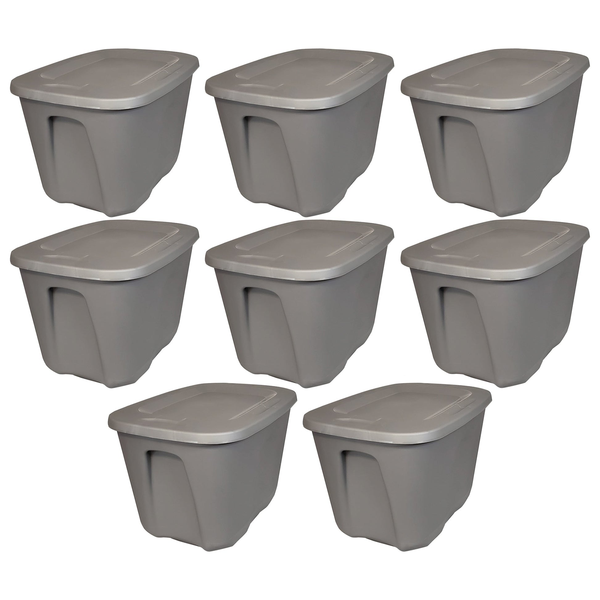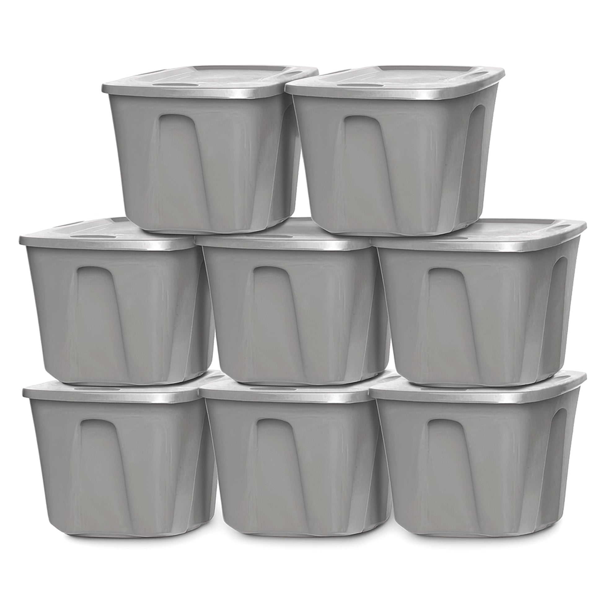 - Set of (8) durable storage container bins with a spacious 10-gallon capacity each that provides ample room for storing a variety of items