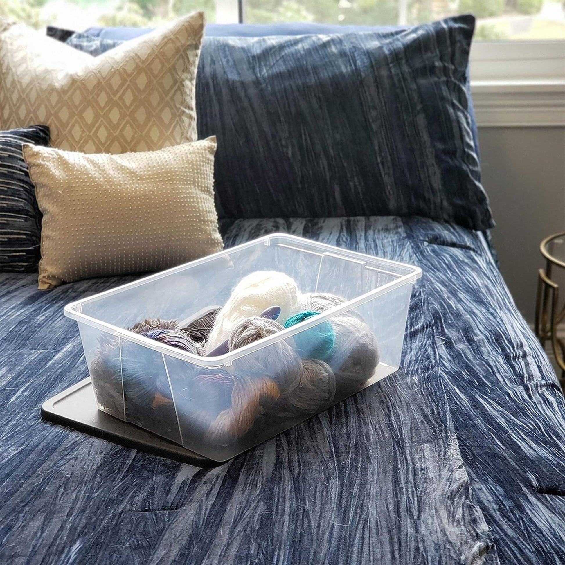 Profoundly indented lids and a modular design enable secure stacking, optimizing vertical storage capacity in your kitchen, bathroom, and closet. Bins fit snugly when stored away, promoting efficient organization. Ideal for bathroom, kitchen, garage, dorm, and off-season storage, these storage containers are designed for extended and enduring utility. Each bin is constructed of robust, high-strength plastic with dimensions of 11 inches long, 16.25 inches wide, and 5.62 inches tall. With the 5.62-inch height, the clear organizer box is great for under-bed storage, too!