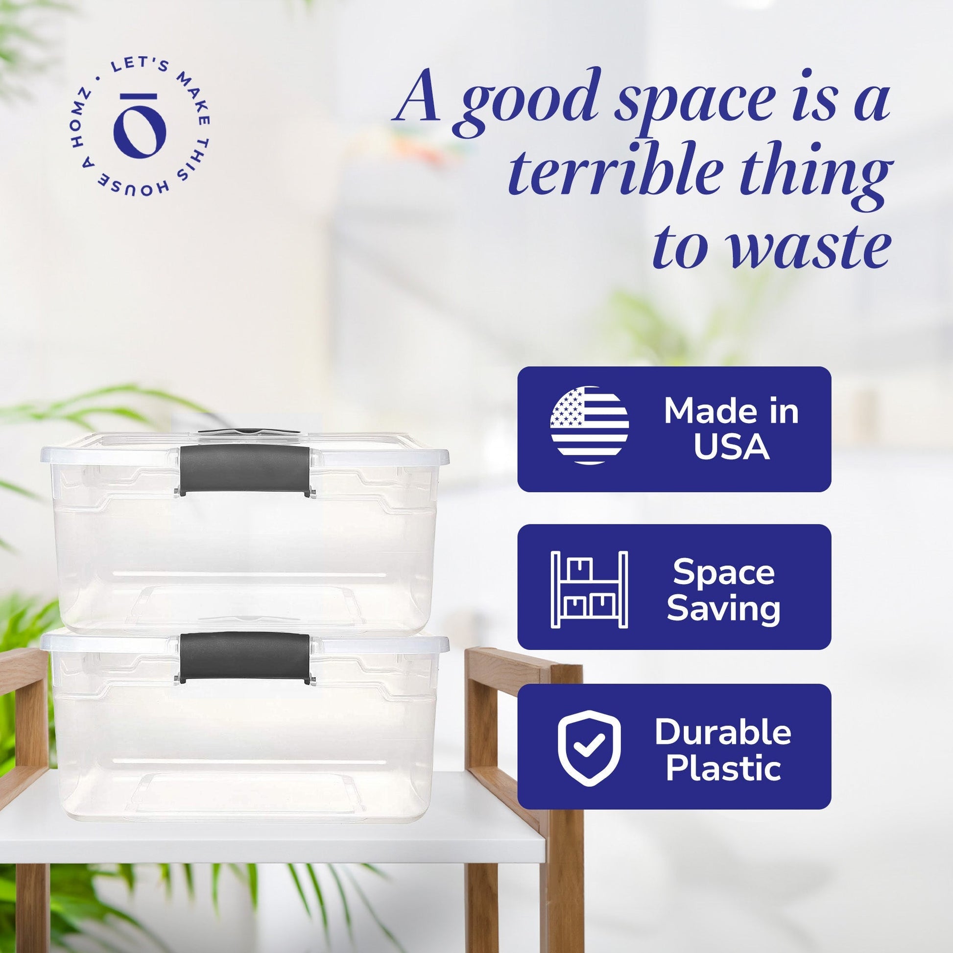 Ideal for a variety of basic household needs, these multipurpose bins can be used to store away clothing items, craft supplies, seasonal decorations, and more. With the spacious 15.5-quart capacity, the opportunities are endless. The ergonomic latching handles lock to secure the lid and provide a comfortable grip for easy carrying. When closing, the lid snaps firmly to the base to ensure all contents stay contained, concealed, and dust-free.