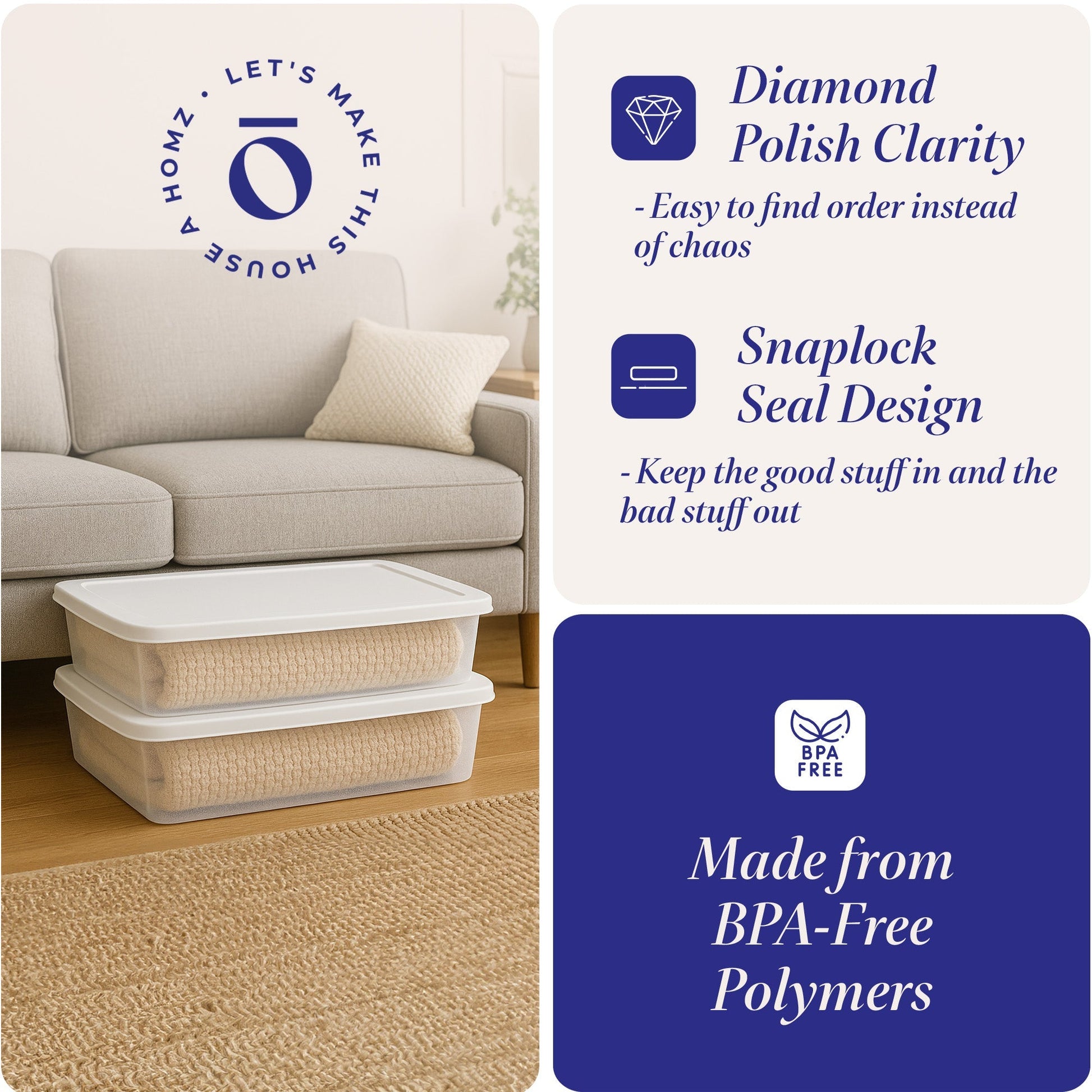 - Set of (2) 28-quart storage bins ideal for office supplies, kitchen utensils, holiday decorations, personal items, and more