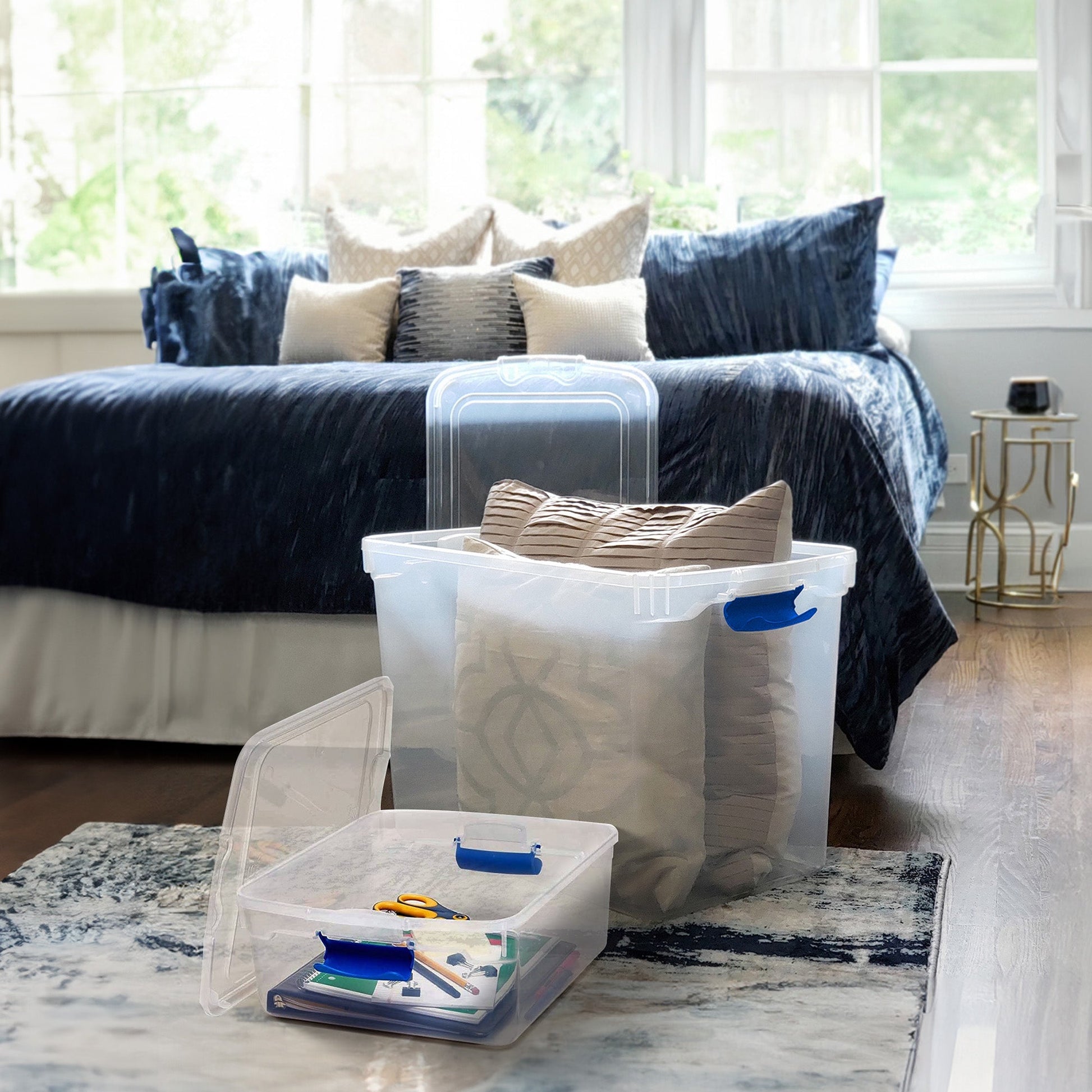 These popular size containers are ideal for a variety of basic household needs, such as sorting and storing away clothing, toys, linens, craft supplies, seasonal decorations, and more. The ergonomic latching handles lock to secure the lid providing a comfortable grip for easy carrying. When locking, the lid snaps firmly into place to ensure all contents stay contained, concealed, and dust-free.