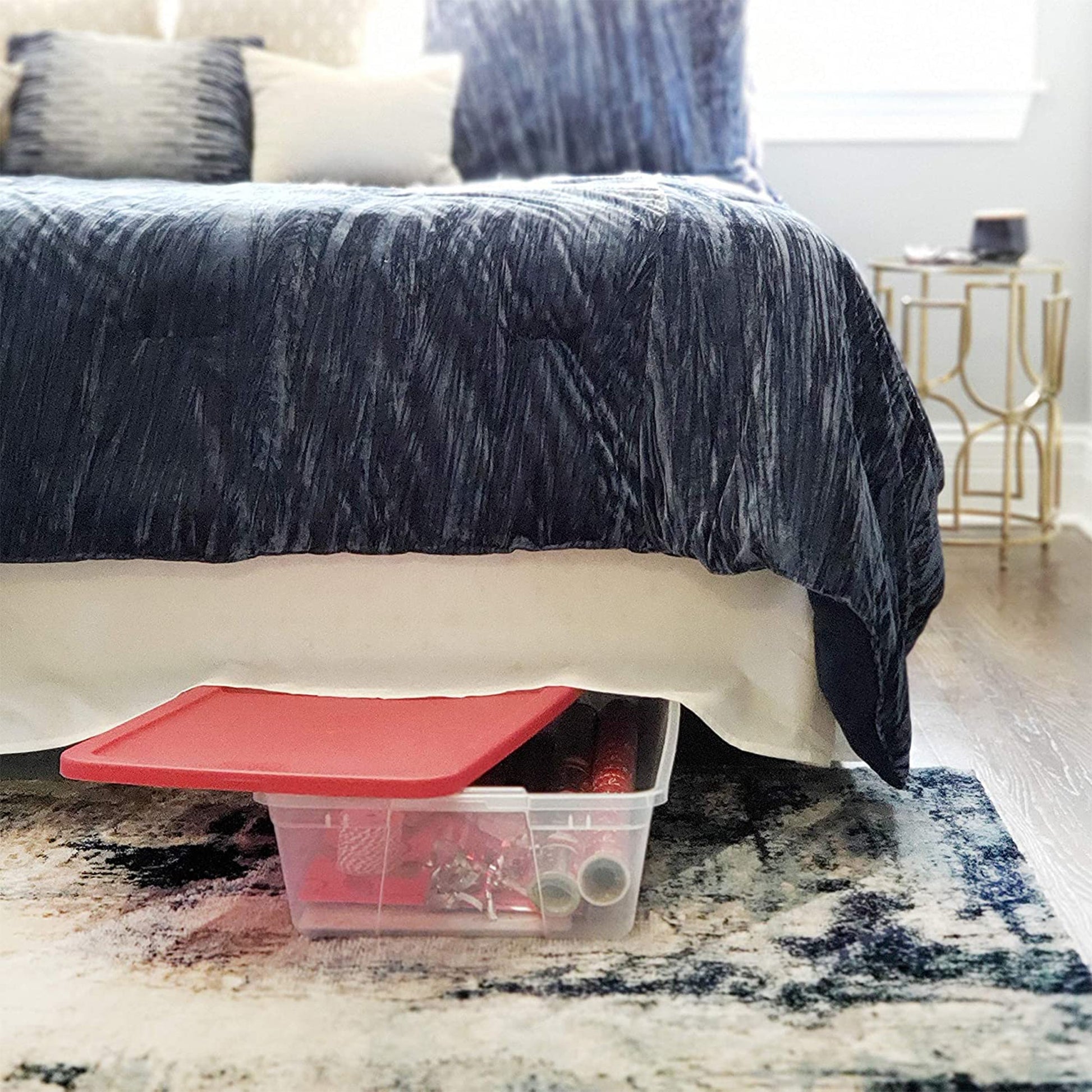 - Set of (4) 41-quart storage bins with shallow profile, great for under-bed storage or stacking