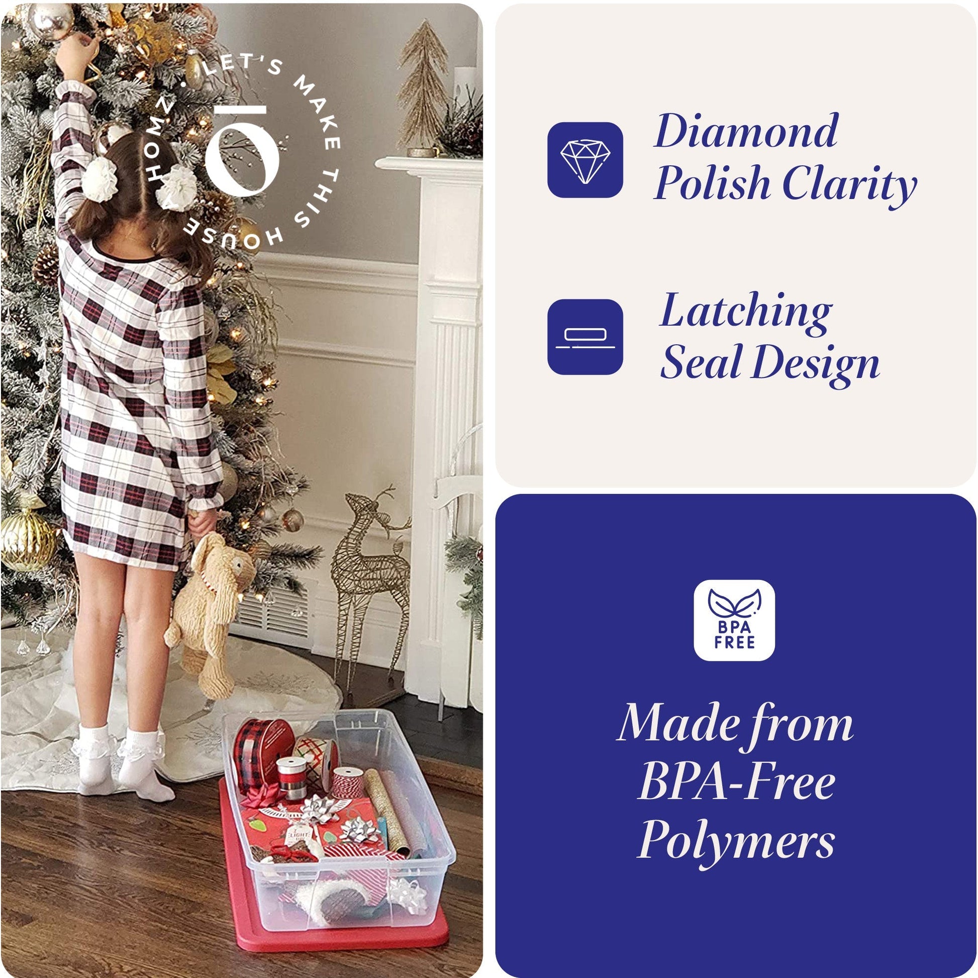 Declutter your space with the beauty of minimalism with the 4-Pack of Homz 41-Quart Clear Plastic Holiday Storage Container with Red Snap Lock Lid.