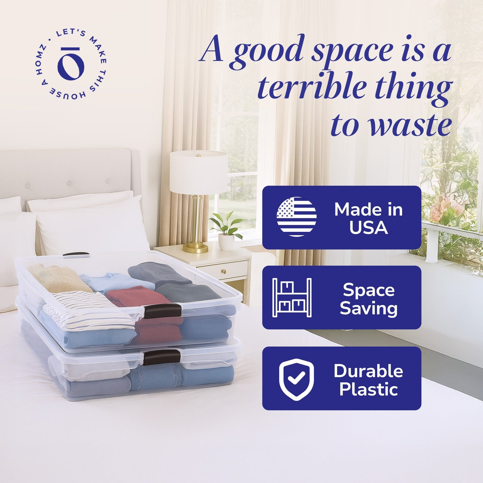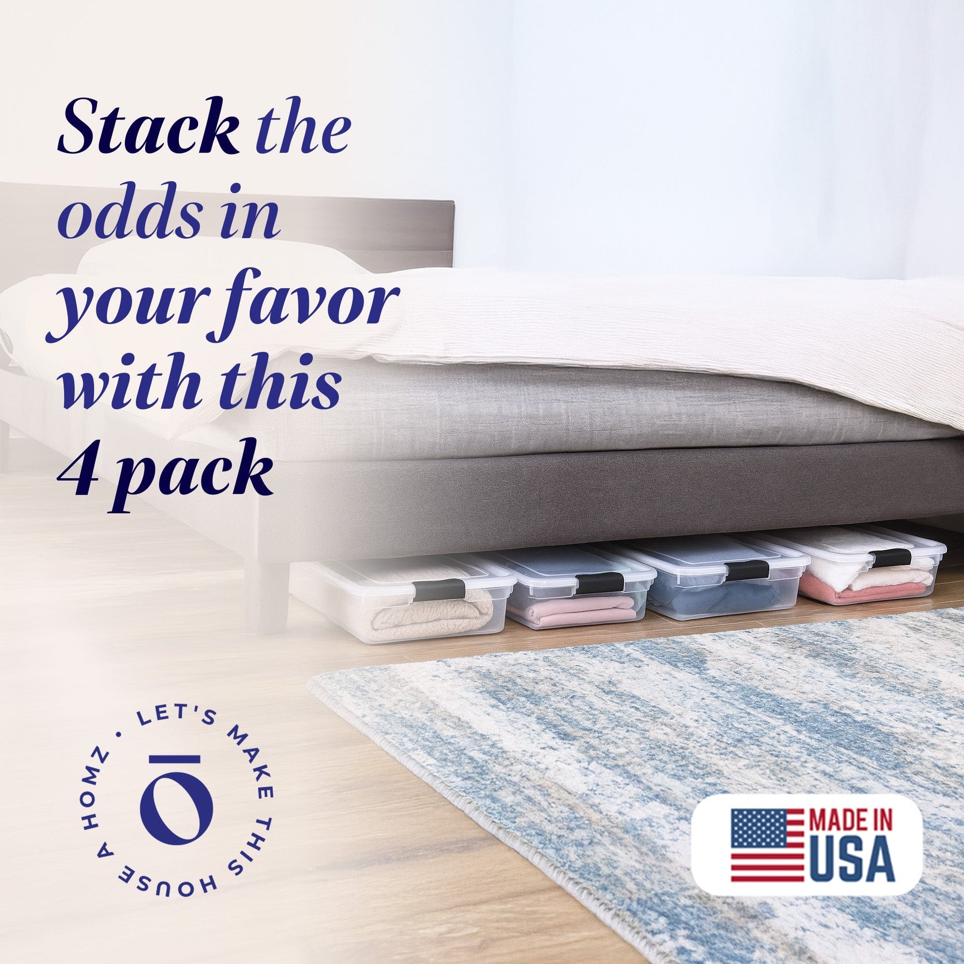 Tidy up the underneath of your bed and store away clutter with the Homz 56-Quart Underbed Clear Plastic Latching Storage Container 4 Pack. These under-bed clear storage containers are a great way to hide clutter and get additional storage space where you least expect it.