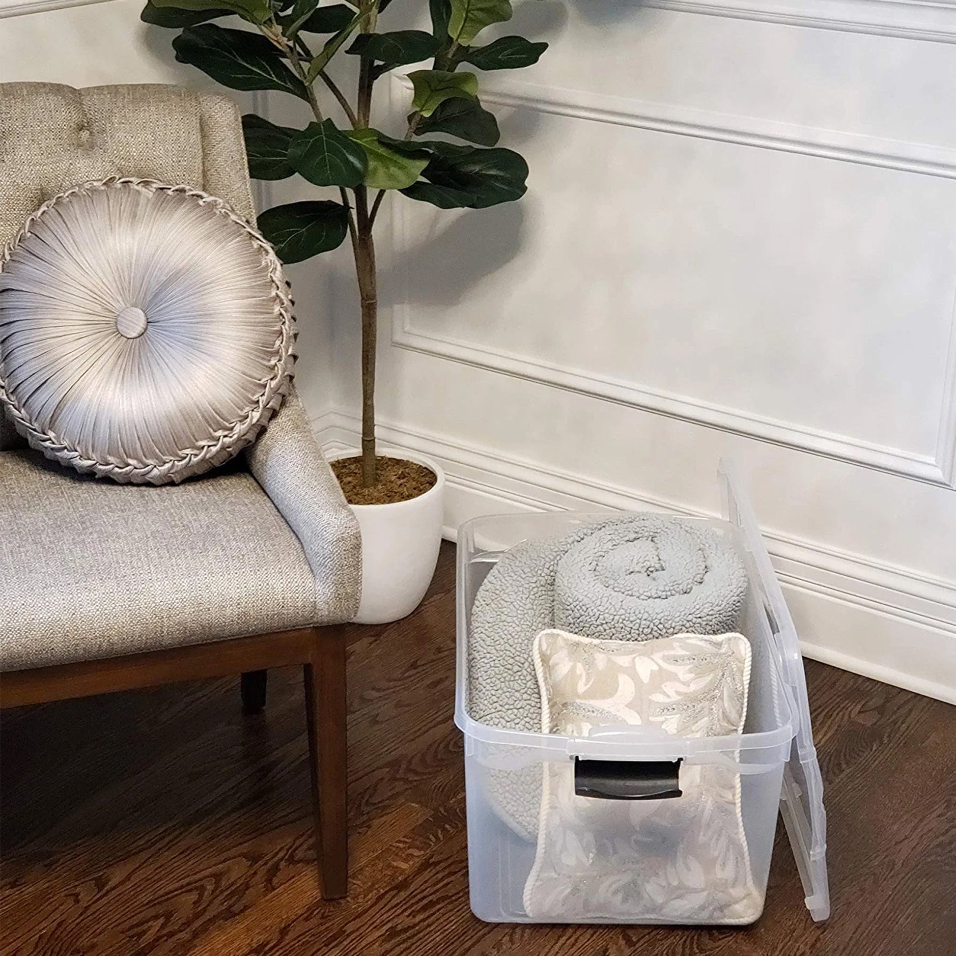 - Pack of (4) multipurpose 66-quart capacity totes is ideal for storing clothing items, seasonal holiday decorations, and other large items around your home
