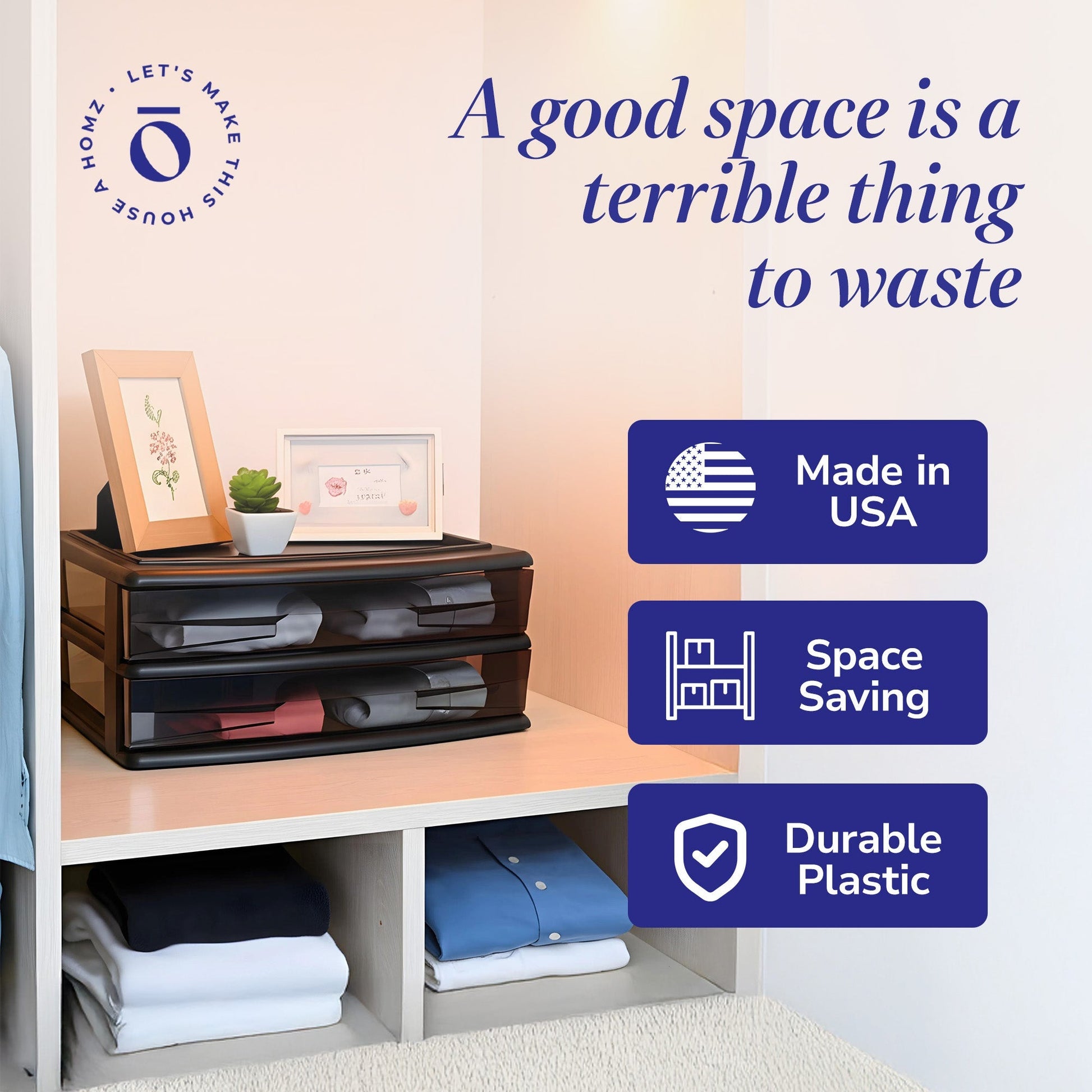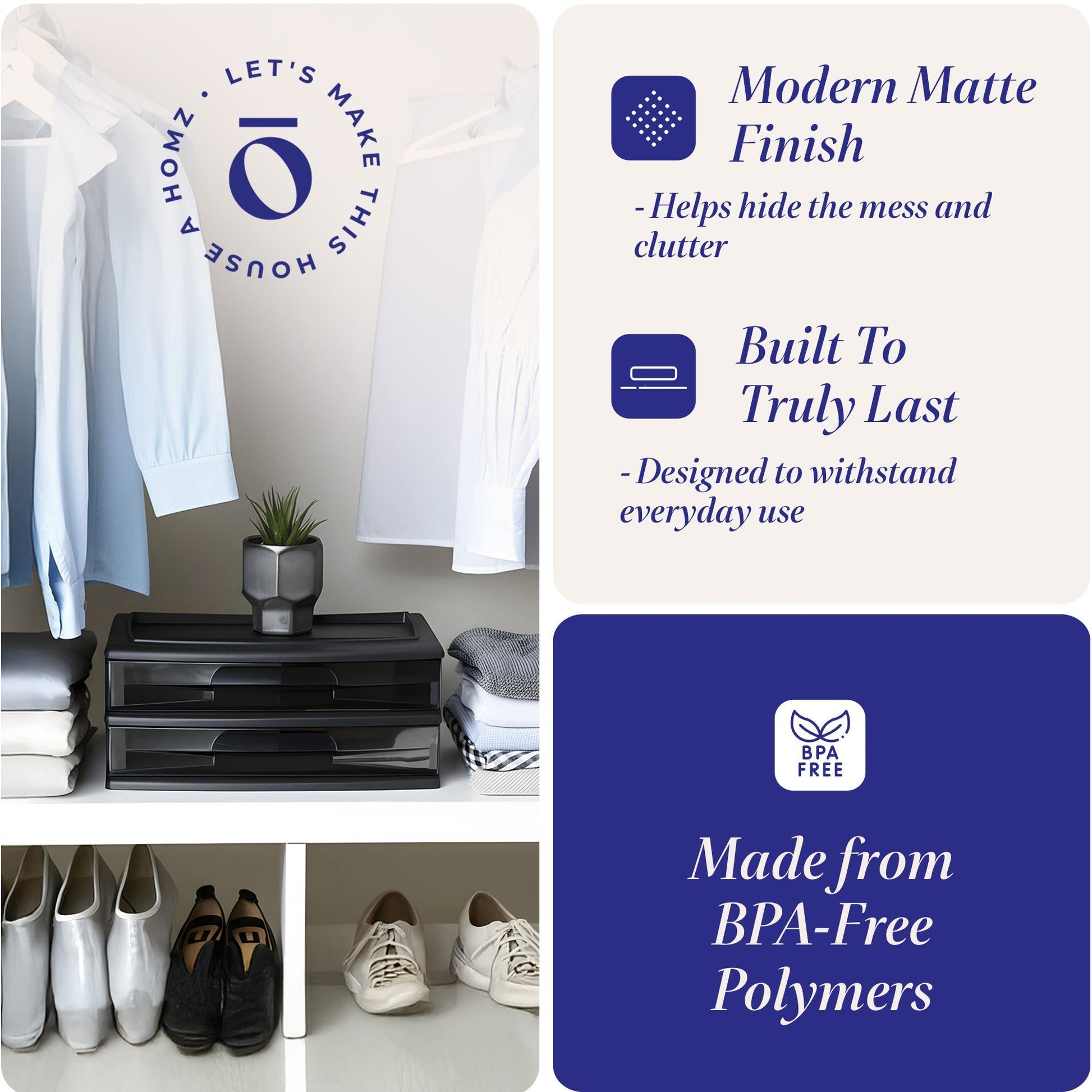 Homz Plastic 2 Drawer Wide Storage Cart, Black Frame with Smoke Drawer, 2 Pack