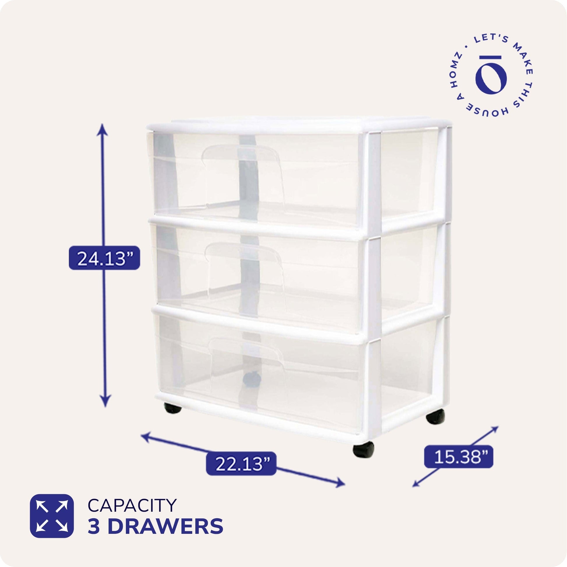 Homz Plastic 3 Clear Drawer Small Rolling Storage Container Tower, White Frame