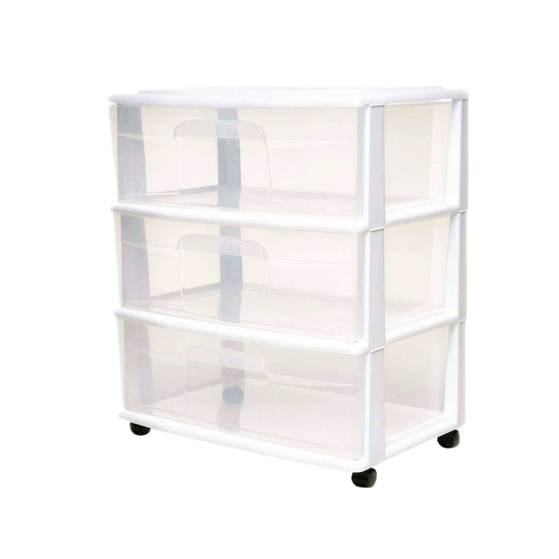 Whether you place it in the bathroom, your bedroom, the laundry room, or kitchen, make use of this convenient storage organizer. The heavy-duty white plastic frame keeps the 3 drawers in place so you can store everything from shoes and clothing to art supplies and holiday decorations. The clear drawer design makes it easy for you to quickly identify the contents without having to remove or open the container. A top recessed lid makes it easy to keep small items in place without rolling off.