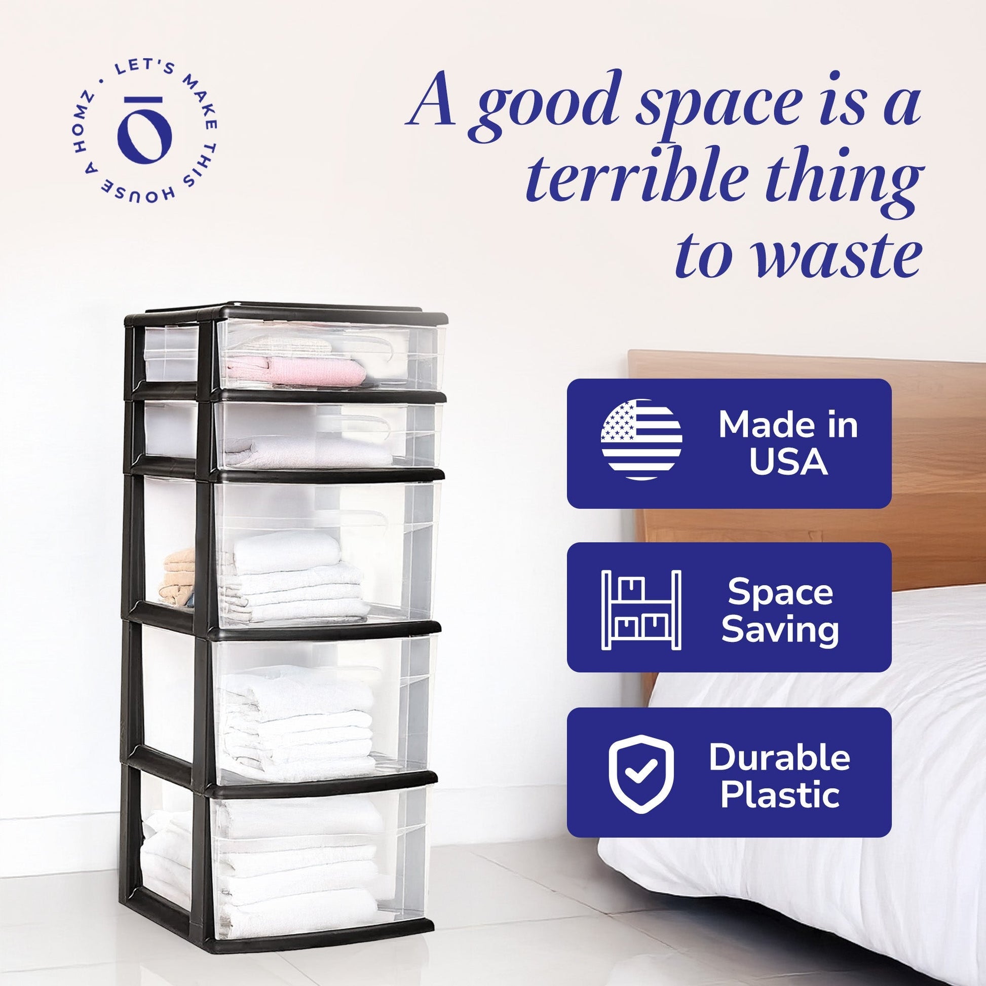 Homz Plastic 5 Drawer Storage Container Tower Closet Organizer, Black, 2 Pack